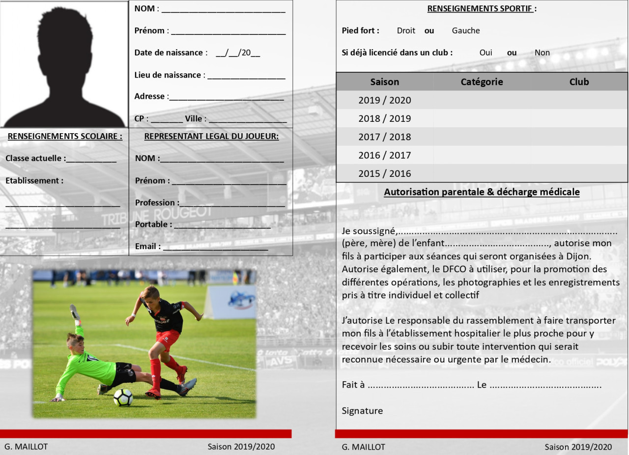 Envoyez ensuite cette fiche d"inscription par mail (g.maillot@asso-dfco.fr) à Guillaume Maillot, coordonnateur du suivi des joueurs de l"École de foot.