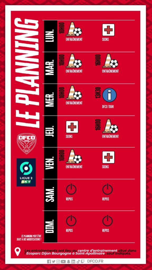 Place à la trêve internationale pour recharger les batteries et continuer de travailler. Omar Daf et son staff ont programmé 6 séances d’entraînement collectif, ainsi que des séances vidéos. Mercredi après-midi, nos joueurs se rendront à Mirebeau-sur-Bèze pour une nouvelle édition du DFCO TOUR by Crédit Mutuel.