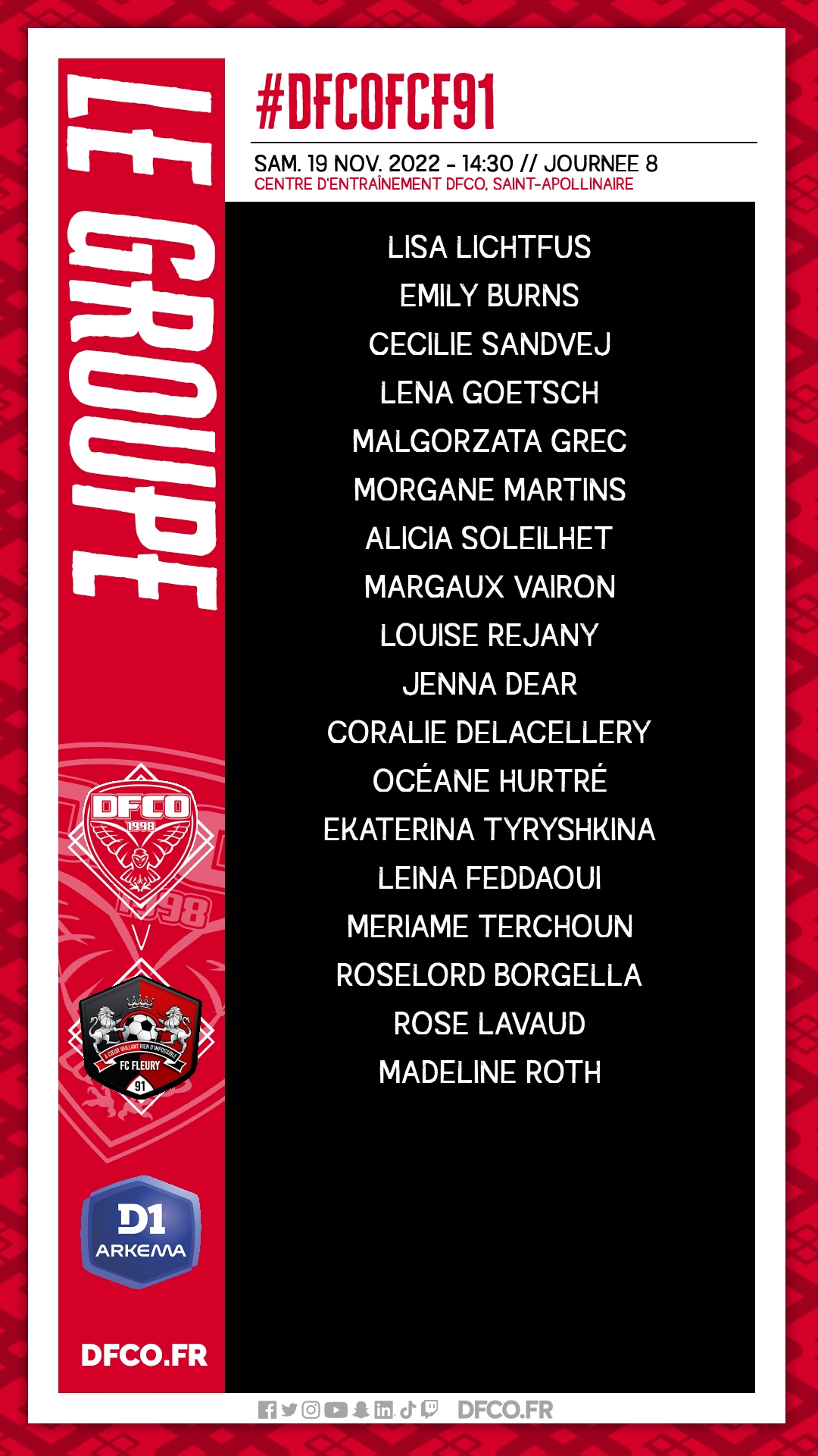 Pour le compte de la 8e journée de D1 Arkema, le DFCO affronte Fleury ce samedi (14h30) sur le terrain du centre d’entraînement de Saint Apollinaire. Christophe Forest et son staff ont convoqué un groupe de 18 joueuses.