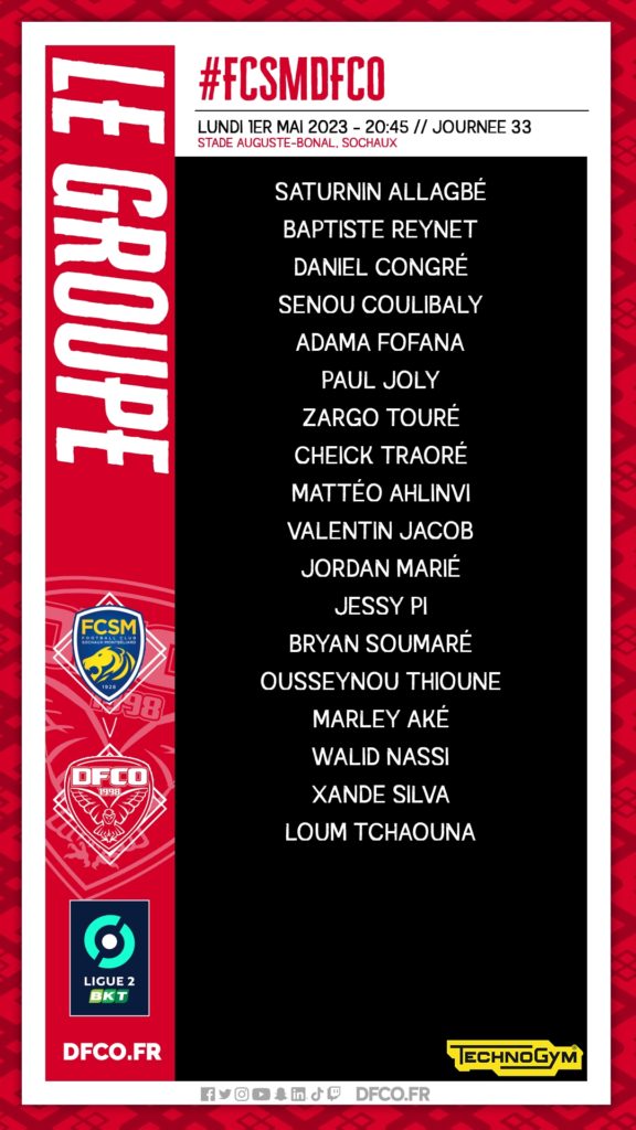 Pour le compte de la 33e journée de Ligue 2 BKT, le DFCO se déplacera sur la pelouse du stade Auguste-Bonal pour affronter le FC Sochaux Montbéliard lundi (20h45). Pascal Dupraz et son staff ont convoqué un groupe de 18 joueurs.