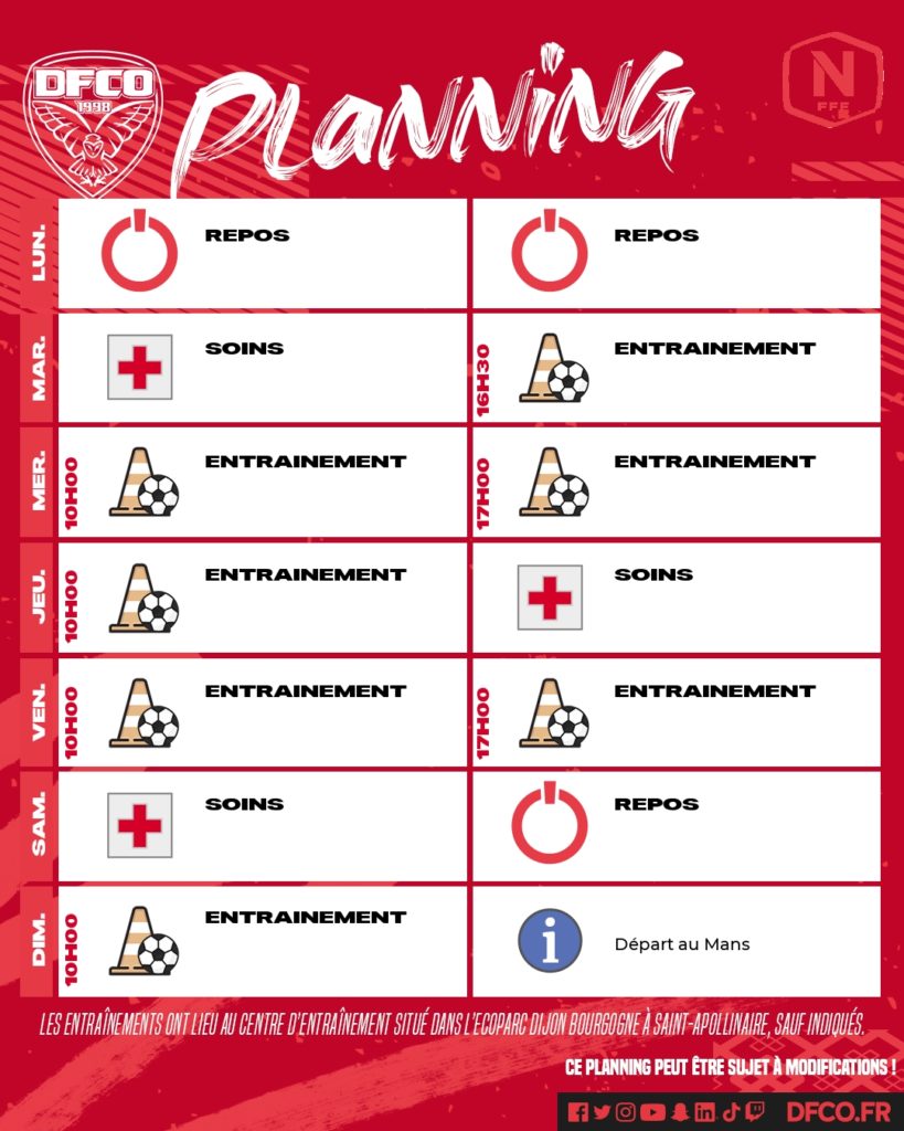 C’est une longue semaine qui attend nos joueurs avant de disputer la 2e journée de National sur la pelouse du Mans le 21 août. Sept séances collectives sont au programme.