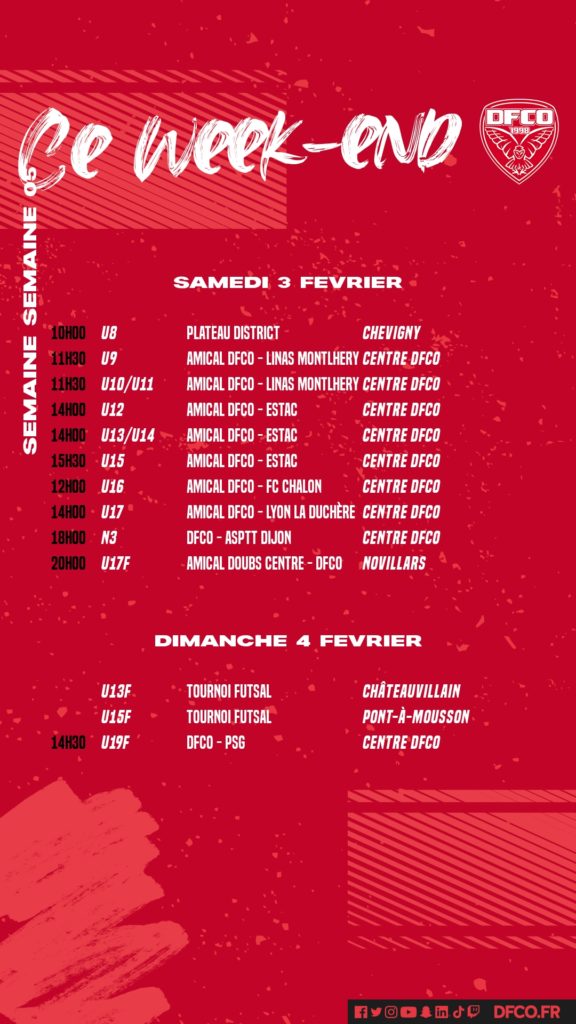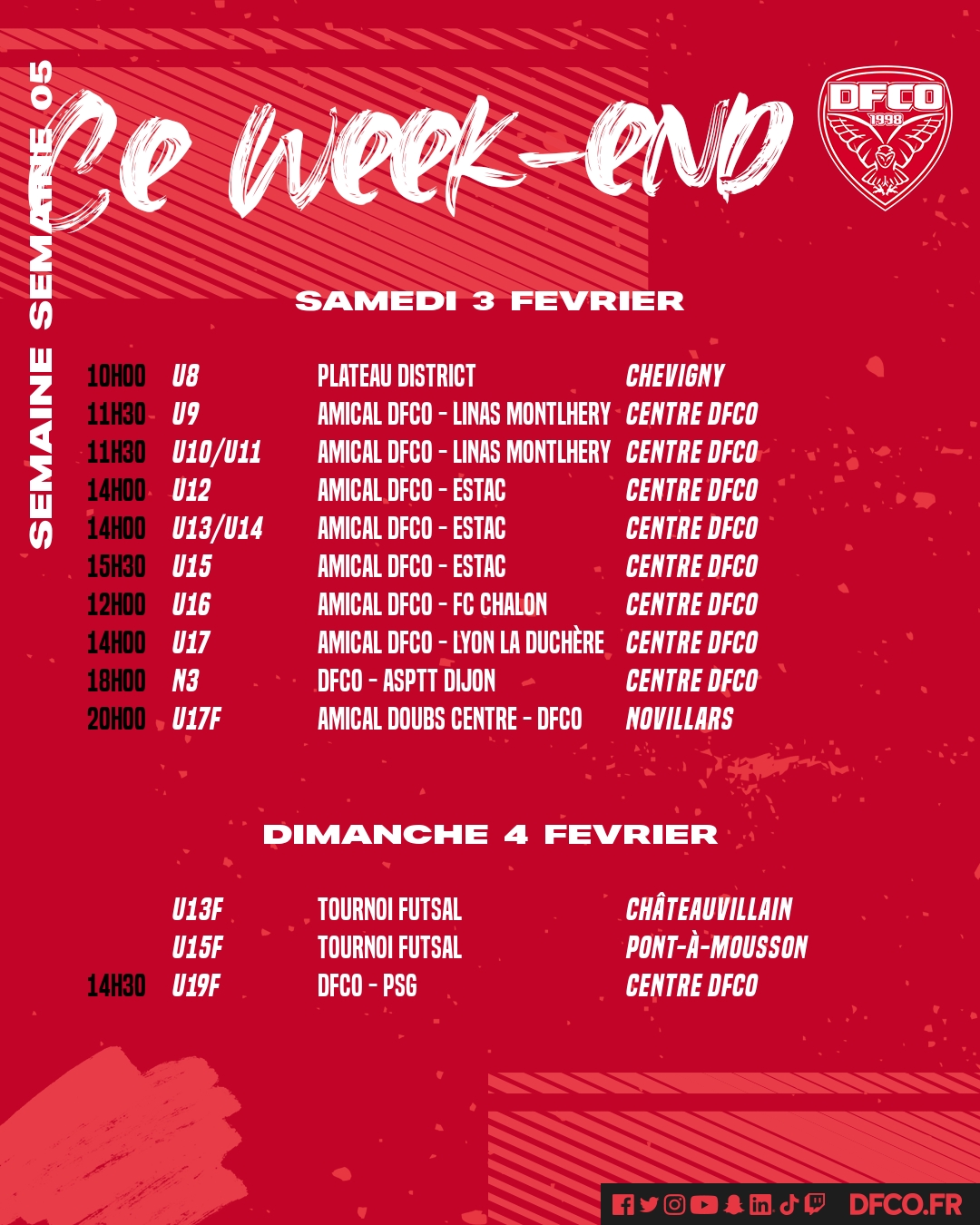 Beaucoup de matchs amicaux en ce premier week-end de février. En championnat, la N3 affrontera l’ASPTT Dijon samedi à 18h au centre d’entraînement de Saint-Apollinaire. Les U19 Féminines affronteront le PSG dimanche à 14h30.