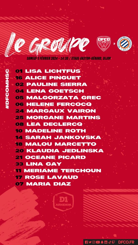 Pour le compte de la quatorzième journée de D1 Arkema, le DFCO recevra Montpellier ce samedi à 14h30 (les infos billetterie). Voici le groupe concocté par Sébastien Joseph et son staff.