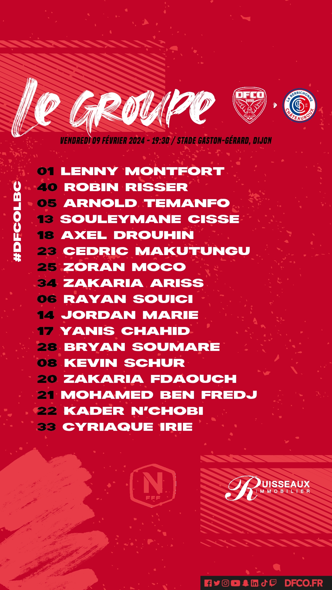 Pour cette rencontre, le DFCO devra se passer des services de Walid Nassi blessé à la cheville. Joseph Mendes reprendra avec la réserve ce samedi. Daniel Congré et Adama Fofana sont forfaits. Retour de Souleymane Cissé et Bryan Soumaré dans le groupe.
