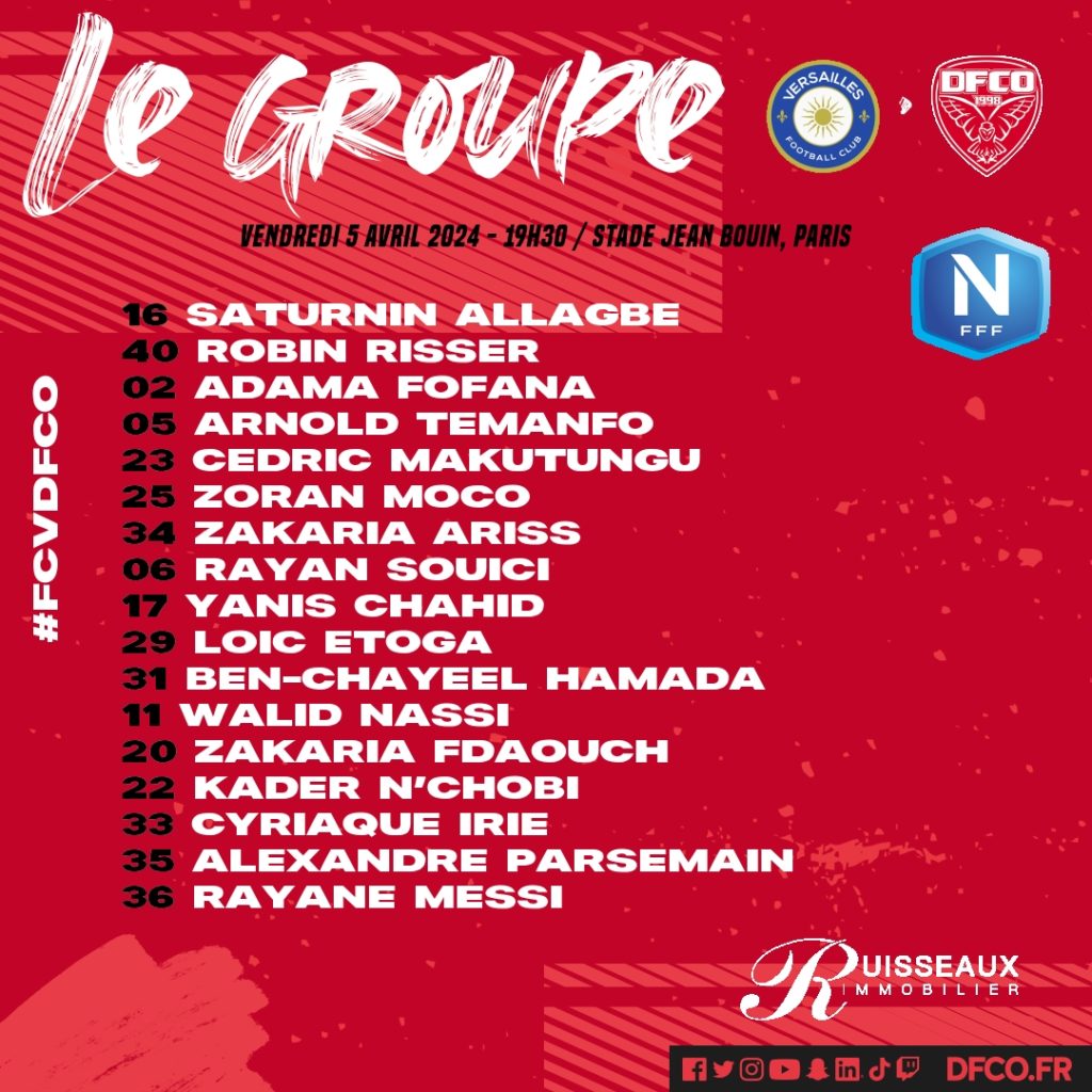 Pour le compte de la 28e journée de National, le DFCO effectuera un déplacement sur la pelouse du stade Jean Bouin pour affronter le FC Versailles (19h30). Benoît Tavenot et son staff ont composé un groupe de 17 joueurs.
