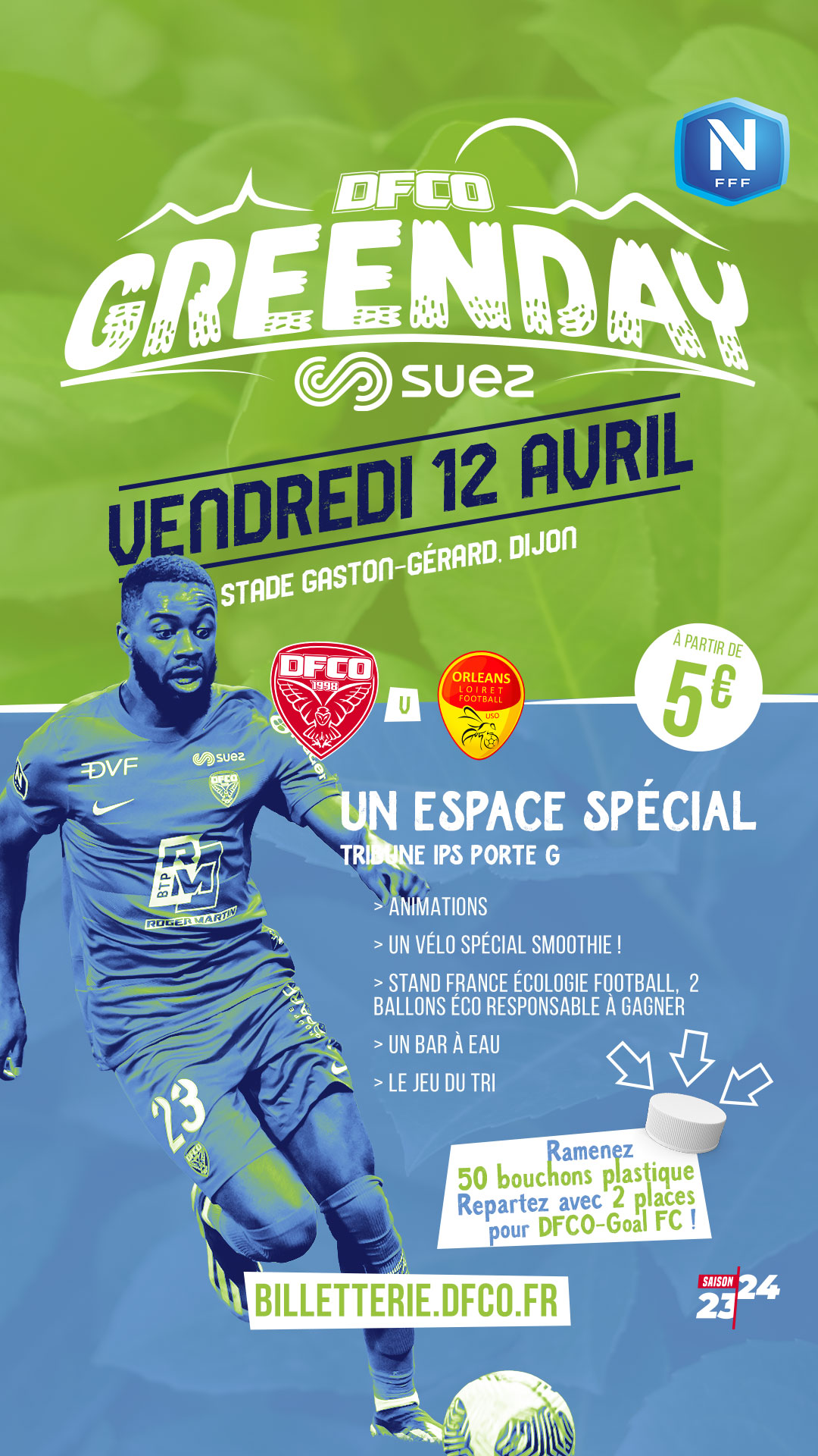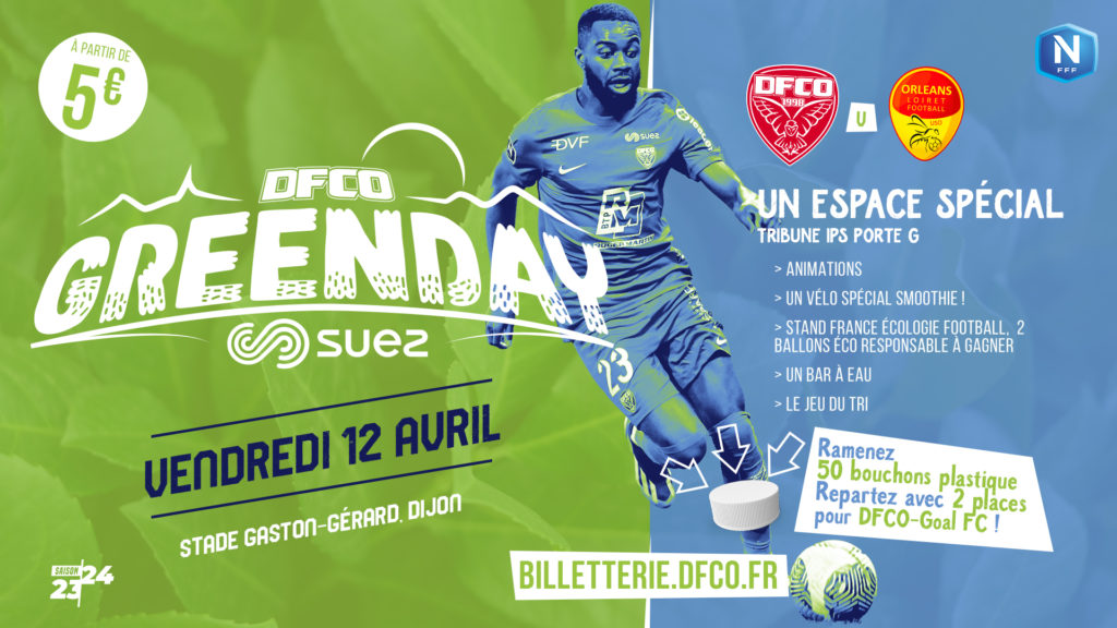 Ce vendredi 12 avril (coup d’envoi 19h30), le DFCO reçoit l’US Orléans ! Un match parrainé par notre partenaire SUEZ, qui proposera des animations sur notre Espace GREENDAY en tribune IPS du stade Gaston-Gérard !