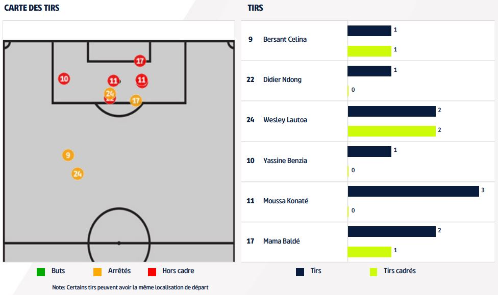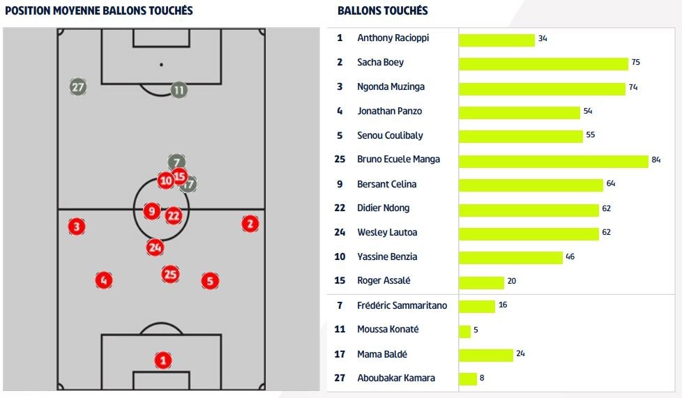 - Bruno Ecuele Manga a touché le plus de ballons contre Reims (84), suivi des Rémois Ghislain Konan (80) et Thomas Foket (76). Sacha Boey et Glody Ngonda ont joué 75 et 74 ballons.