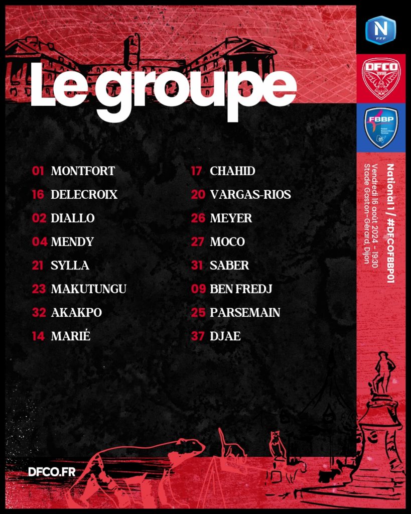 Pour le coup d’envoi de la saison 2024/2025, le DFCO reçoit Bourg-en-Bresse au stade Gaston-Gérard ce vendredi 16 août (19h30). Découvrez le premier groupe concocté par Baptiste Ridira et son staff.