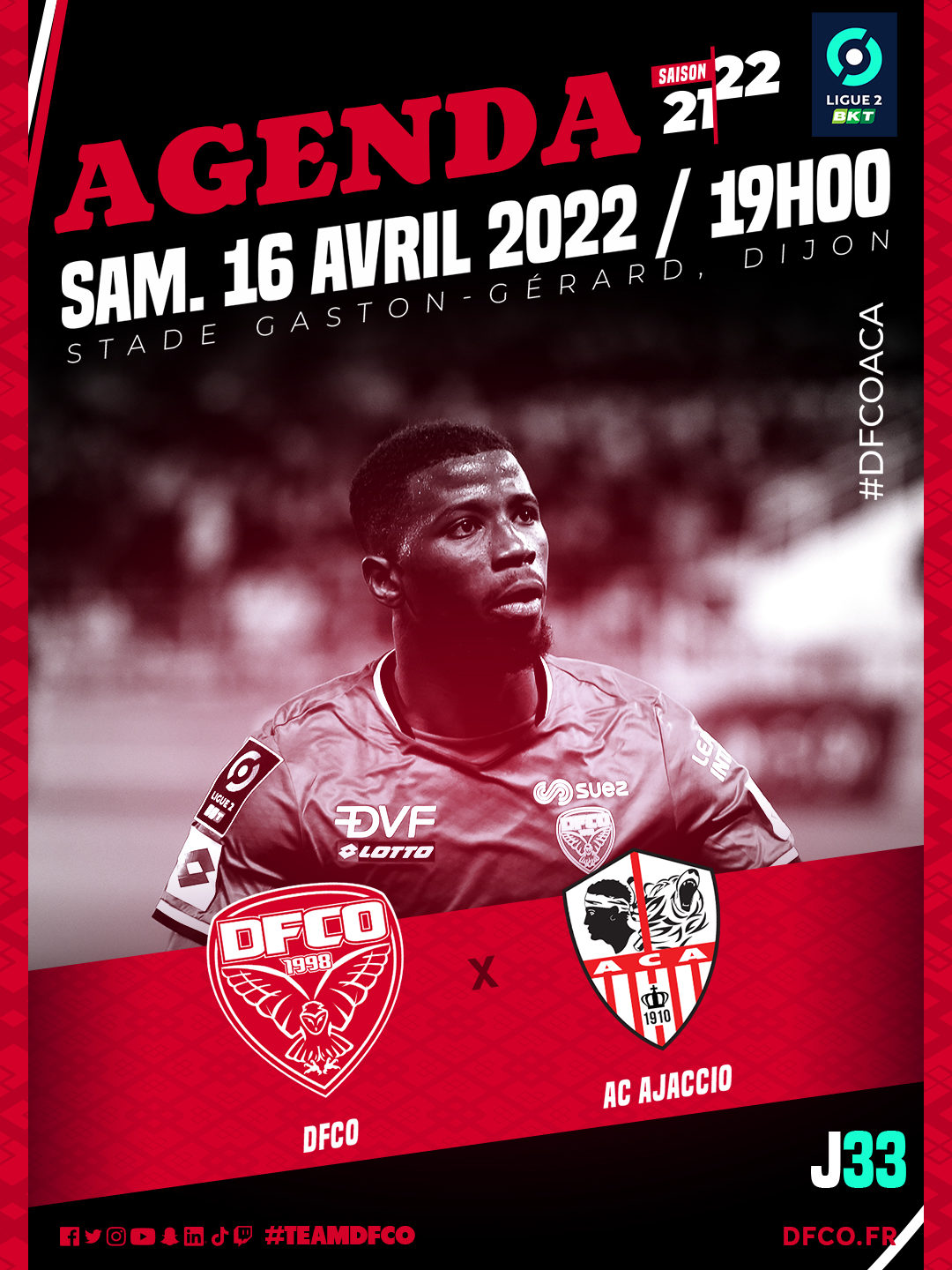 Le samedi 16 avril (33e journée de Ligue 2 BKT / 19h00), le DFCO recevra l’AC Ajaccio, prétendant à la montée en Ligue 1 ! Face aux Corses, les Rouges auront à coeur de signer un quatrième succès consécutif à domicile !