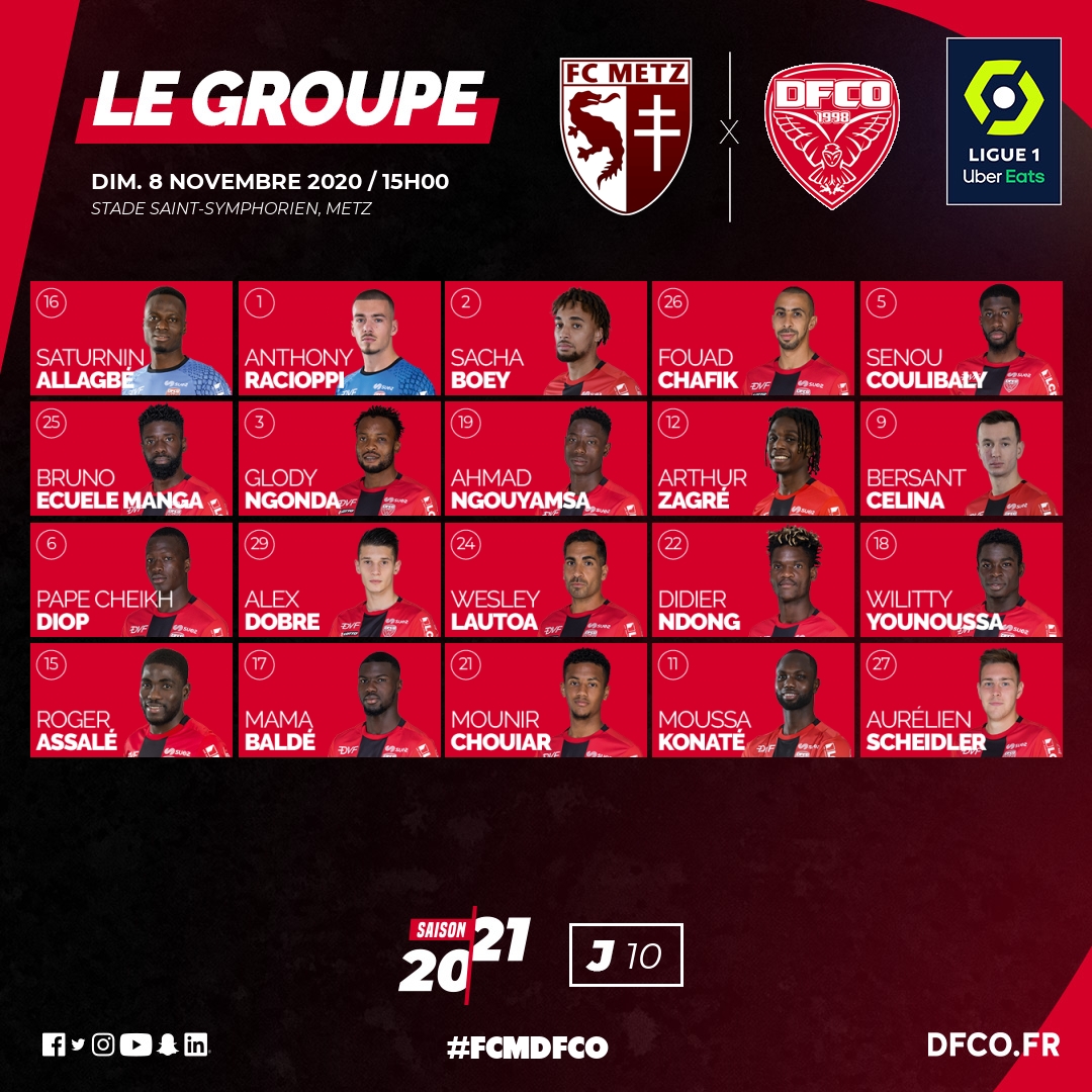 Dimanche (15h00), le DFCO se déplacera sur la pelouse du stade Saint-Symphorien pour affronter le FC Metz (10e journée de Ligue 1 Uber Eats). David Linarès et son staff ont convoqué un groupe de 20 joueurs.