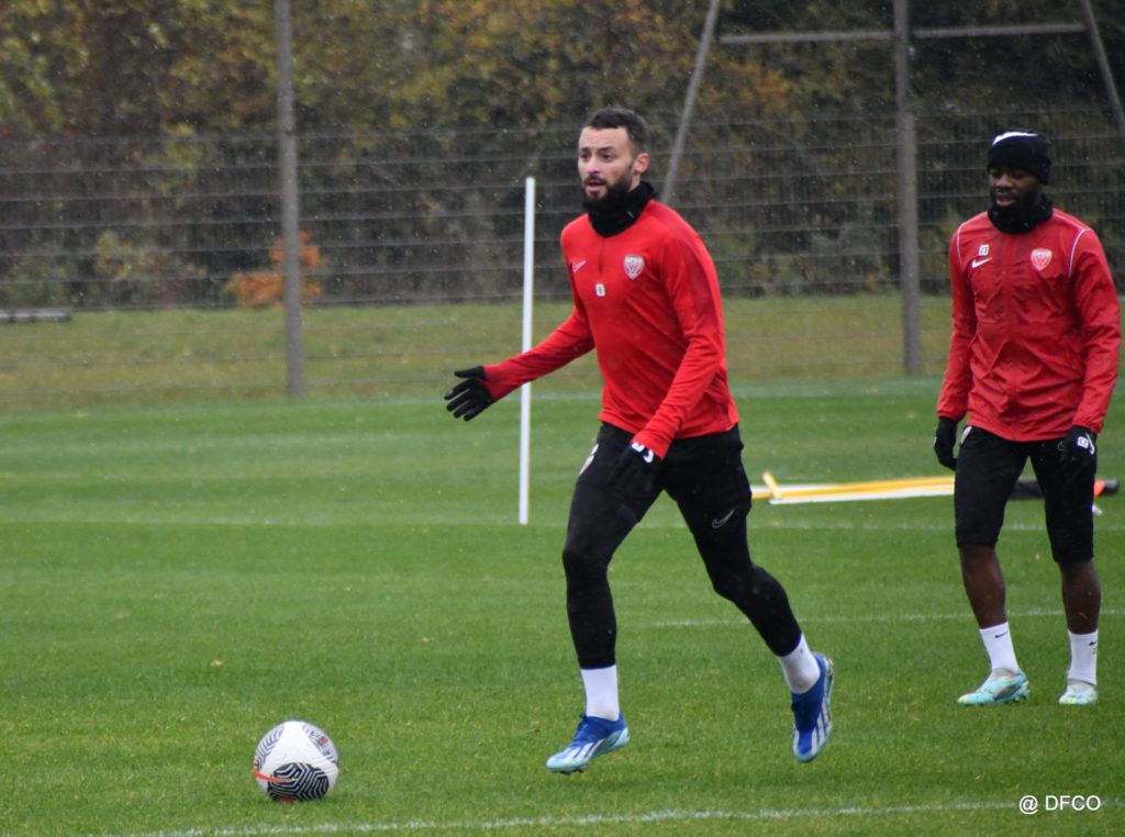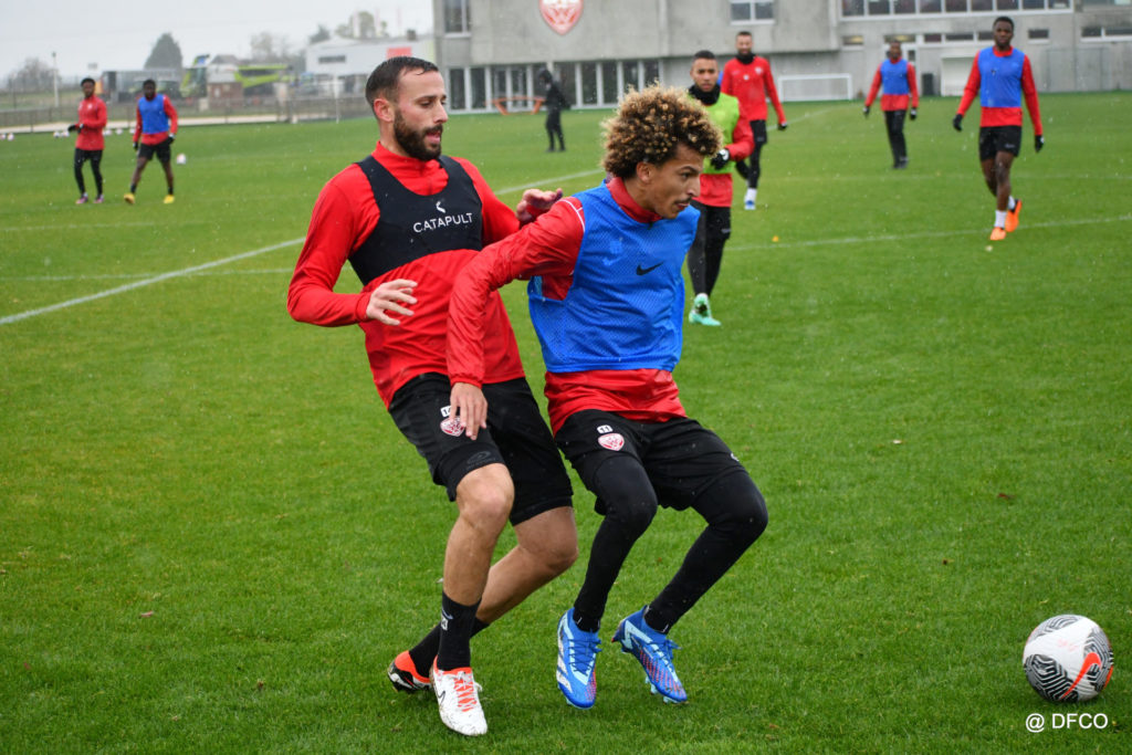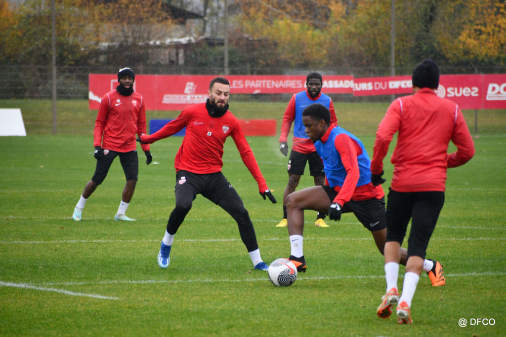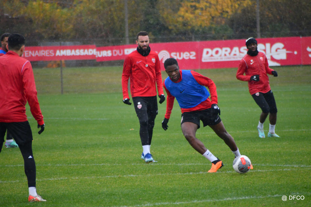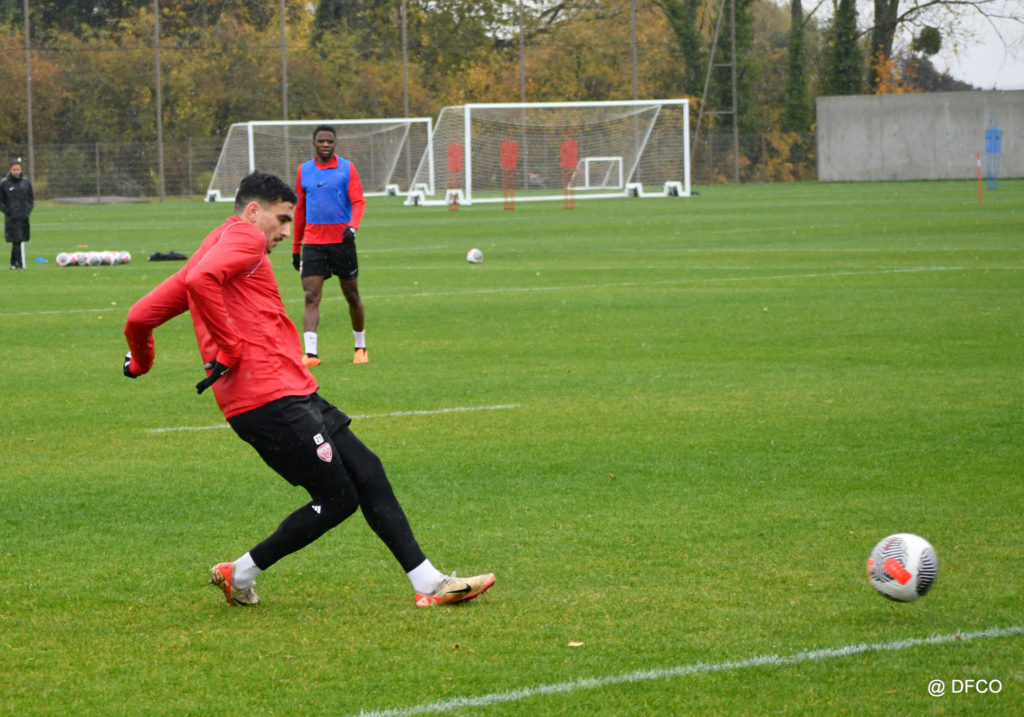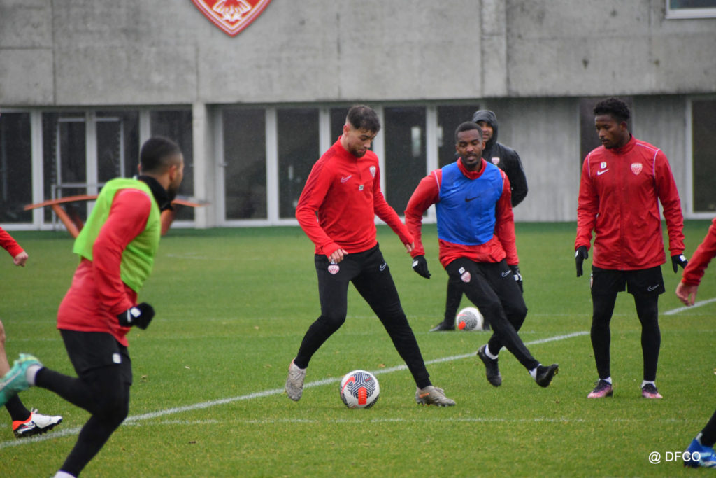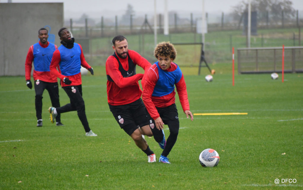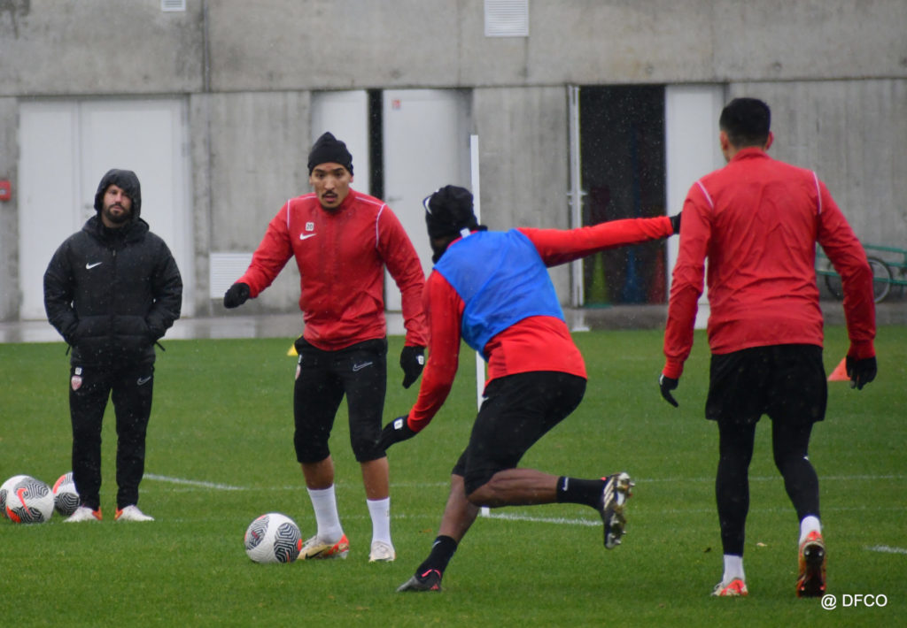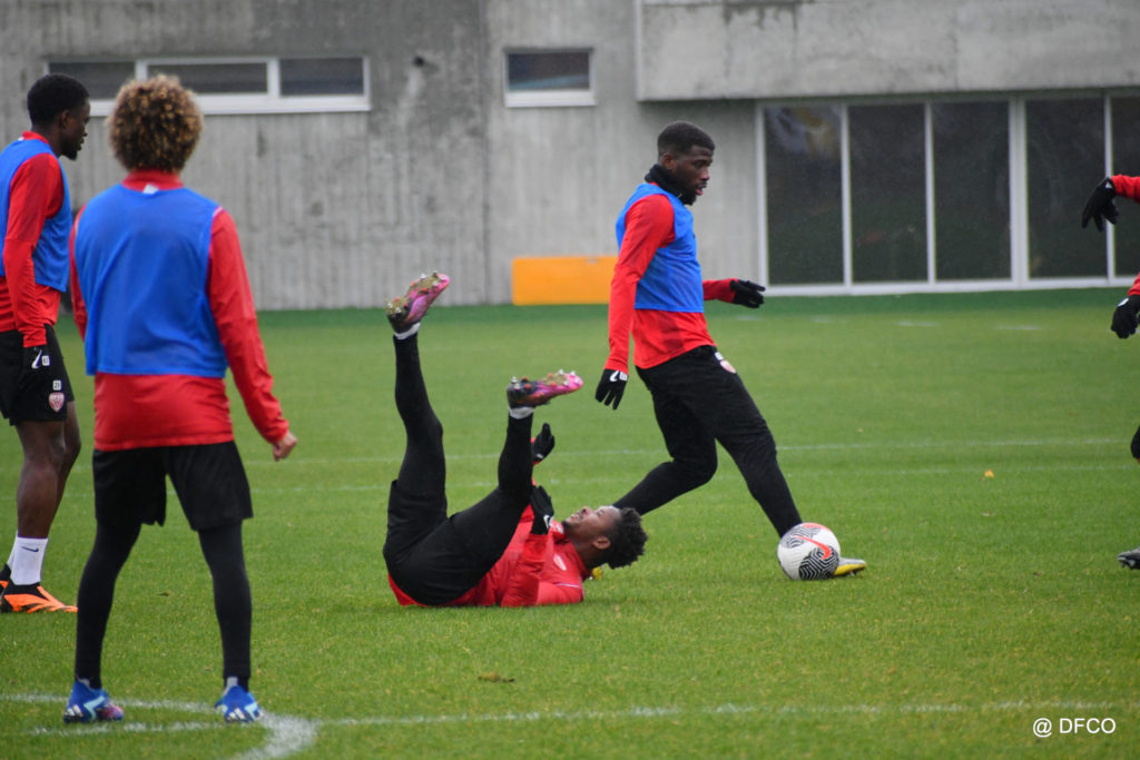 Après avoir partagé l’après-midi avec les participants du DFCO Tour by Crédit Mutuel (voir en cliquant ici), les Rouges ont retrouvé la pluie sur la séance matinale de jeudi, à deux jours de se déplacer sur la pelouse du RC Doullens, près d’Amiens, pour le compte du 7e tour de Coupe de France.
