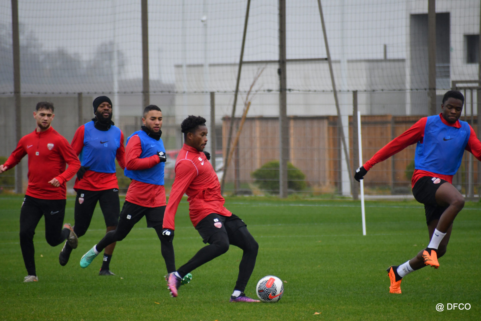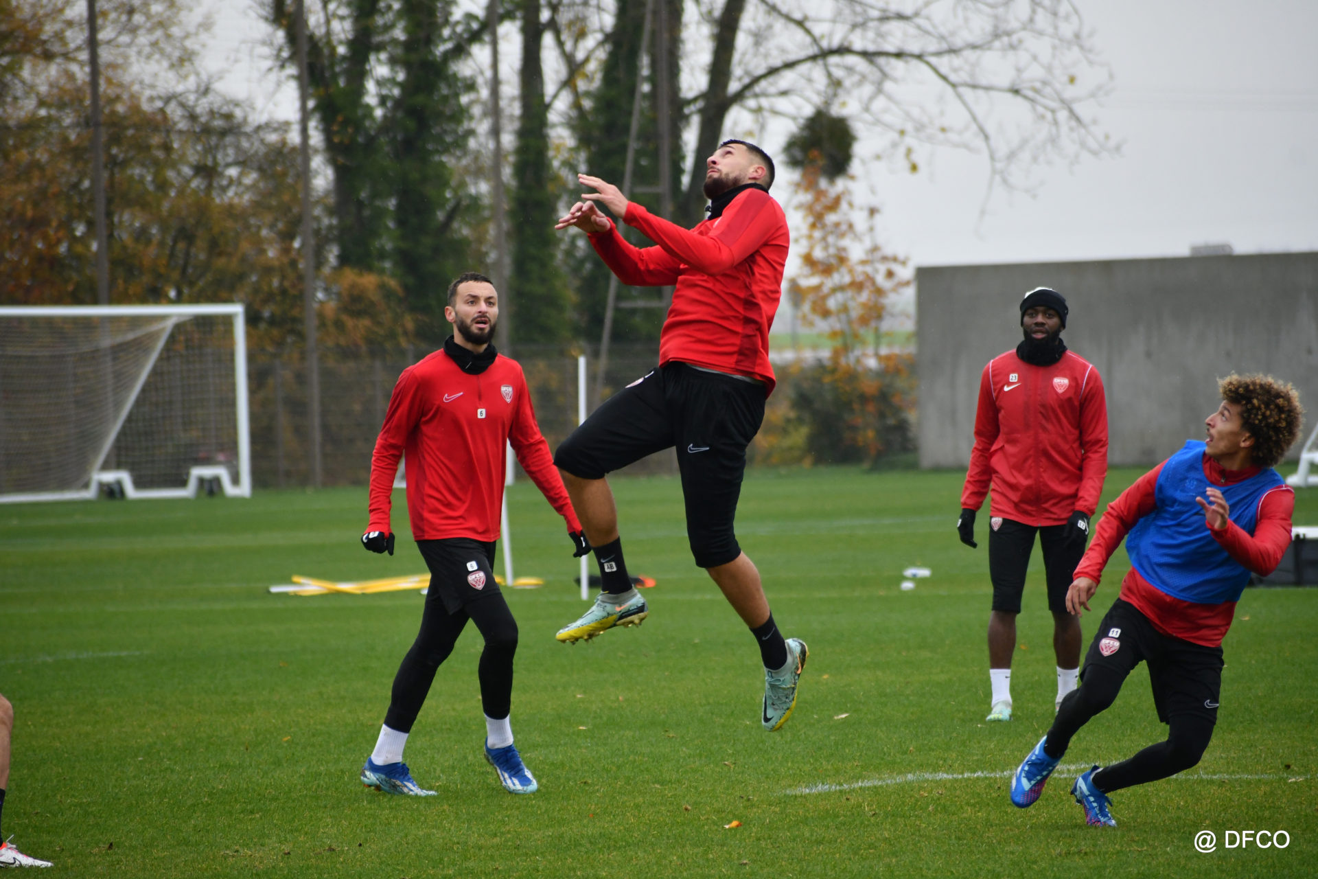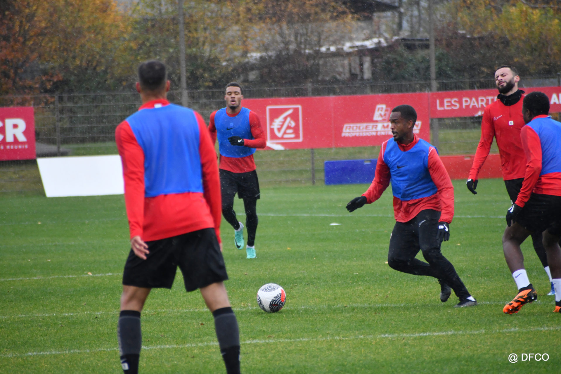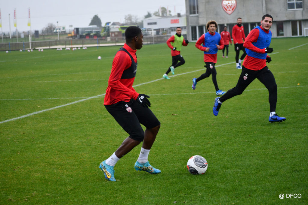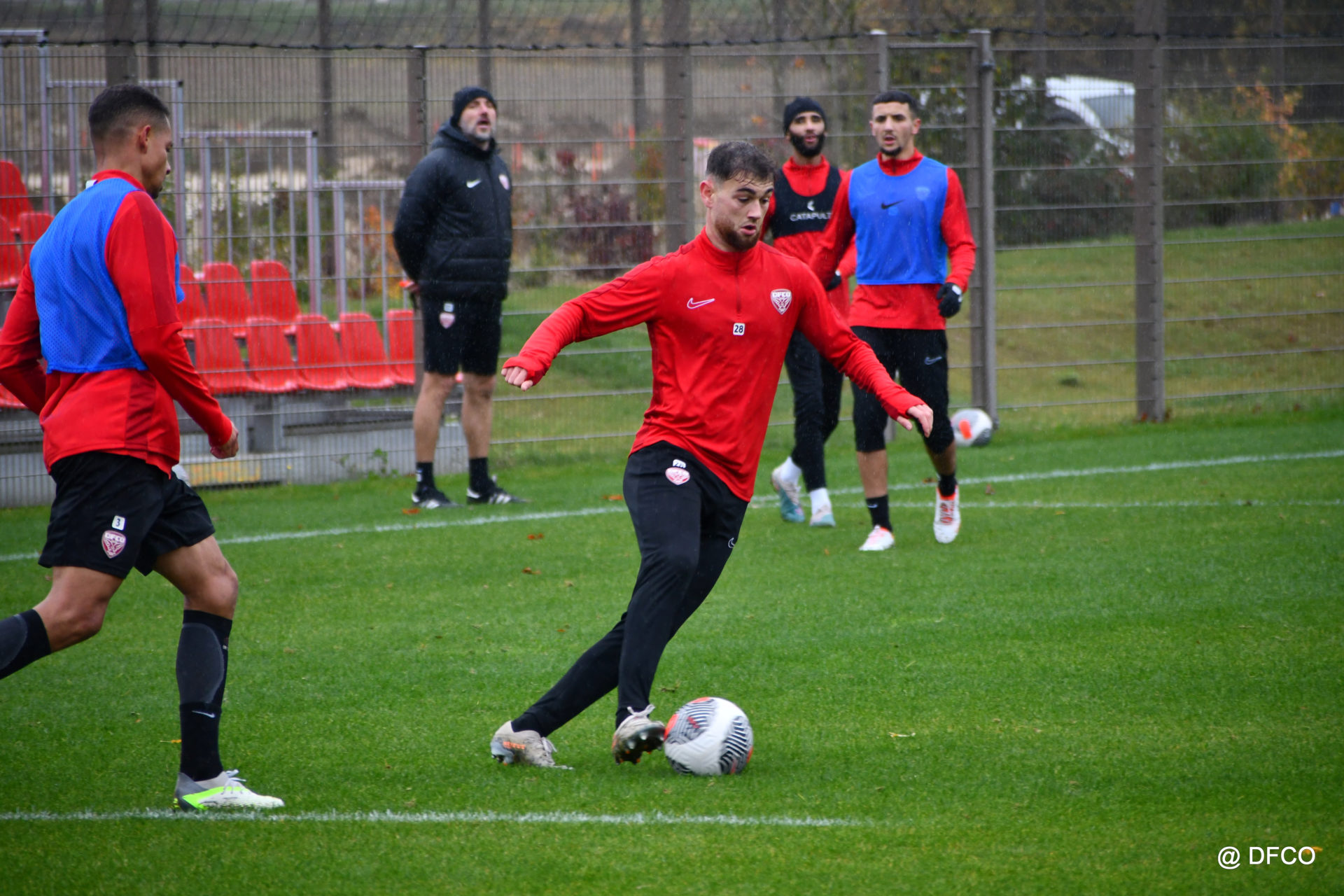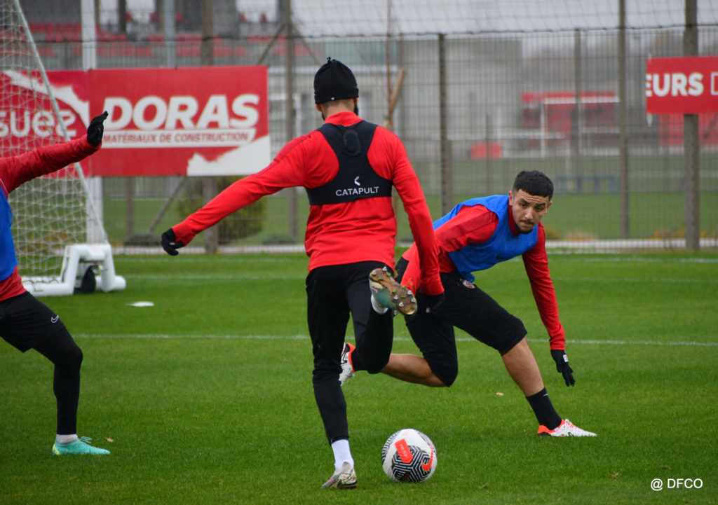 Après avoir partagé l’après-midi avec les participants du DFCO Tour by Crédit Mutuel (voir en cliquant ici), les Rouges ont retrouvé la pluie sur la séance matinale de jeudi, à deux jours de se déplacer sur la pelouse du RC Doullens, près d’Amiens, pour le compte du 7e tour de Coupe de France.