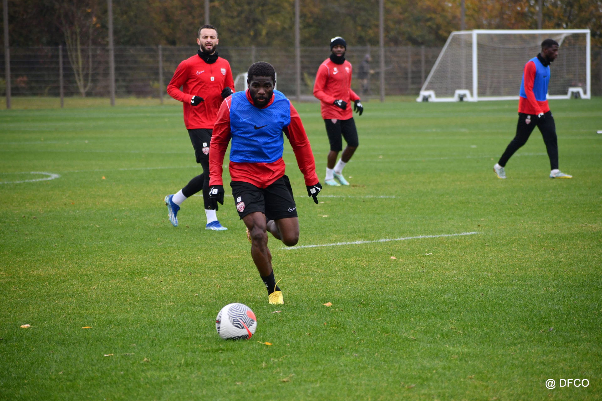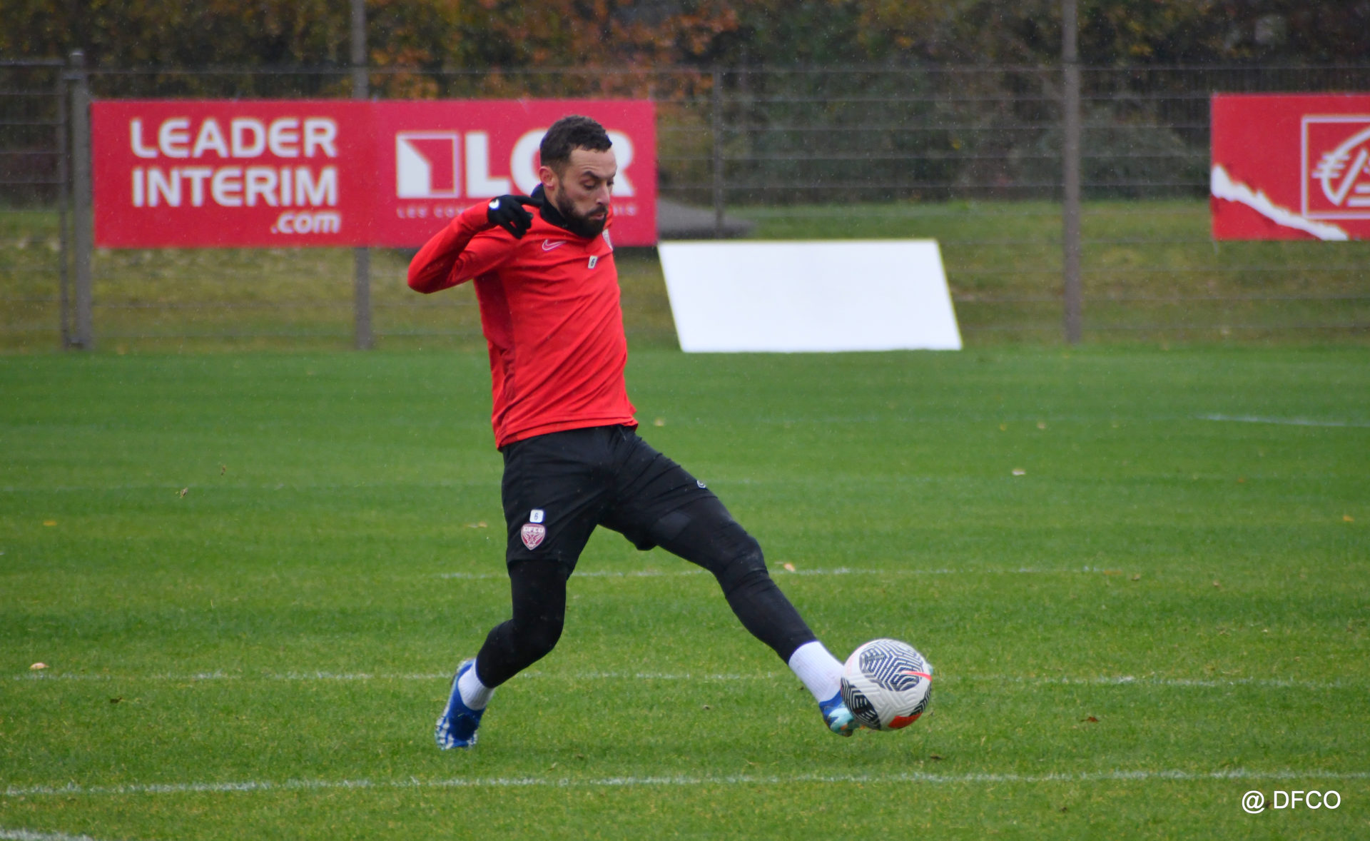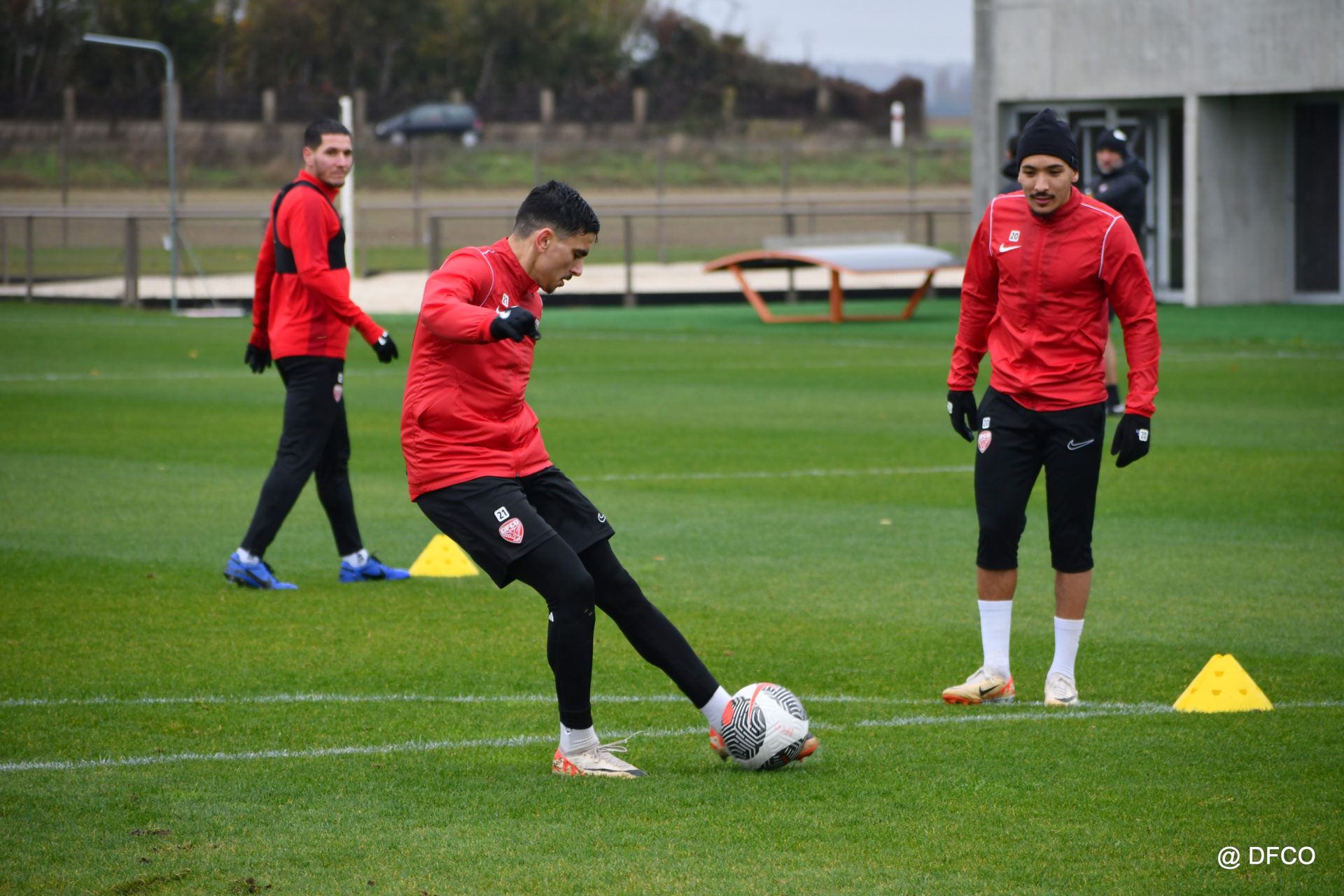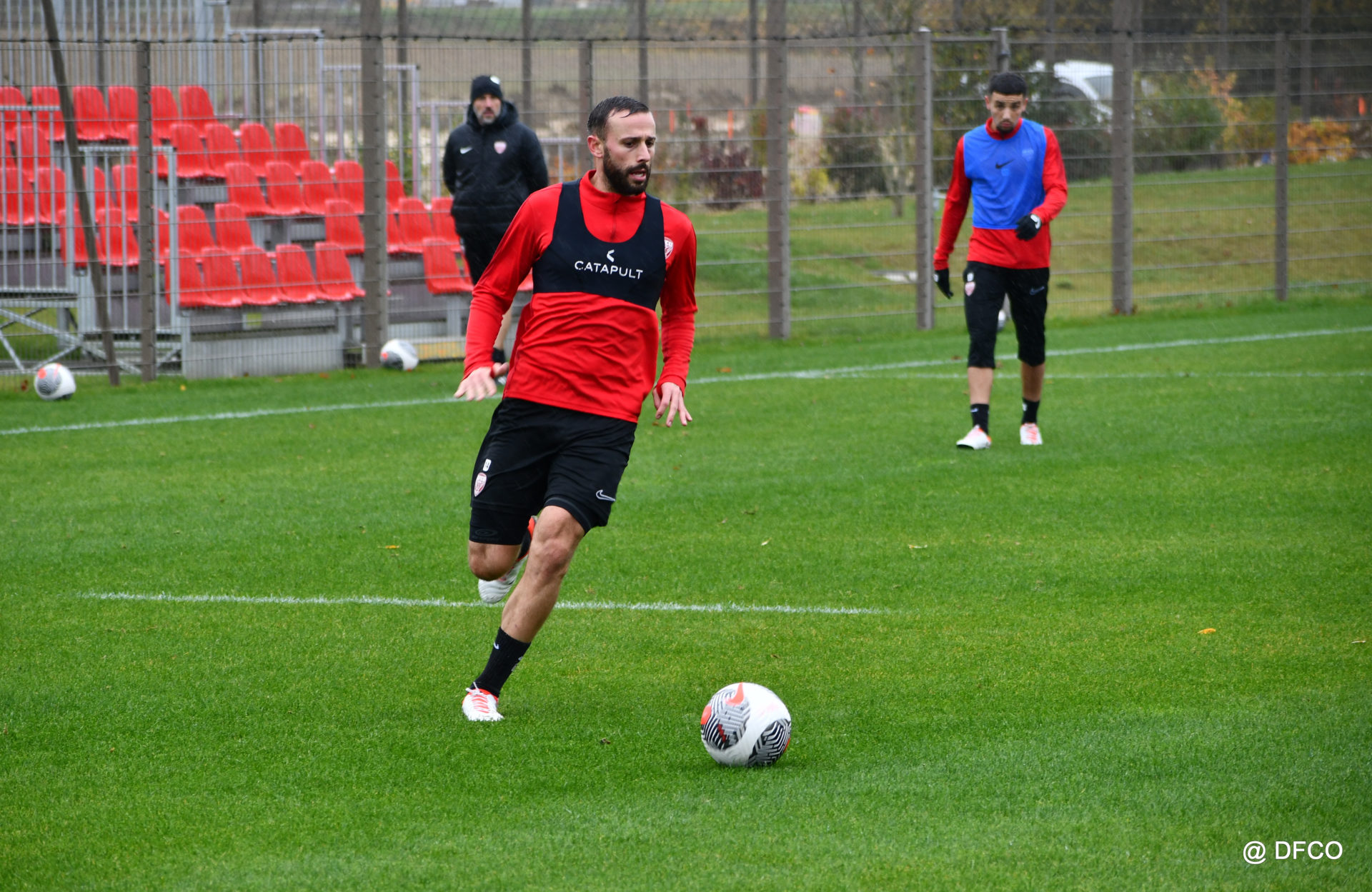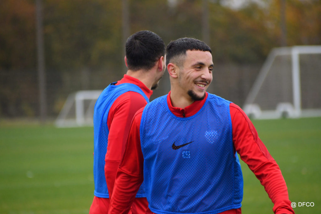 Après avoir partagé l’après-midi avec les participants du DFCO Tour by Crédit Mutuel (voir en cliquant ici), les Rouges ont retrouvé la pluie sur la séance matinale de jeudi, à deux jours de se déplacer sur la pelouse du RC Doullens, près d’Amiens, pour le compte du 7e tour de Coupe de France.