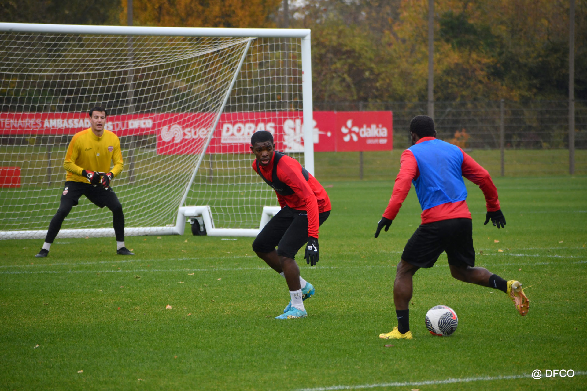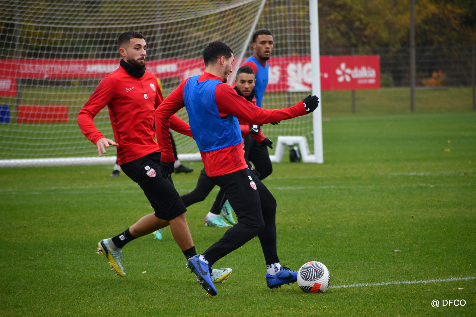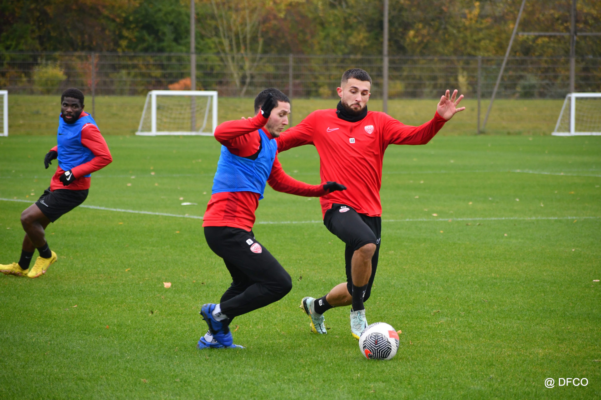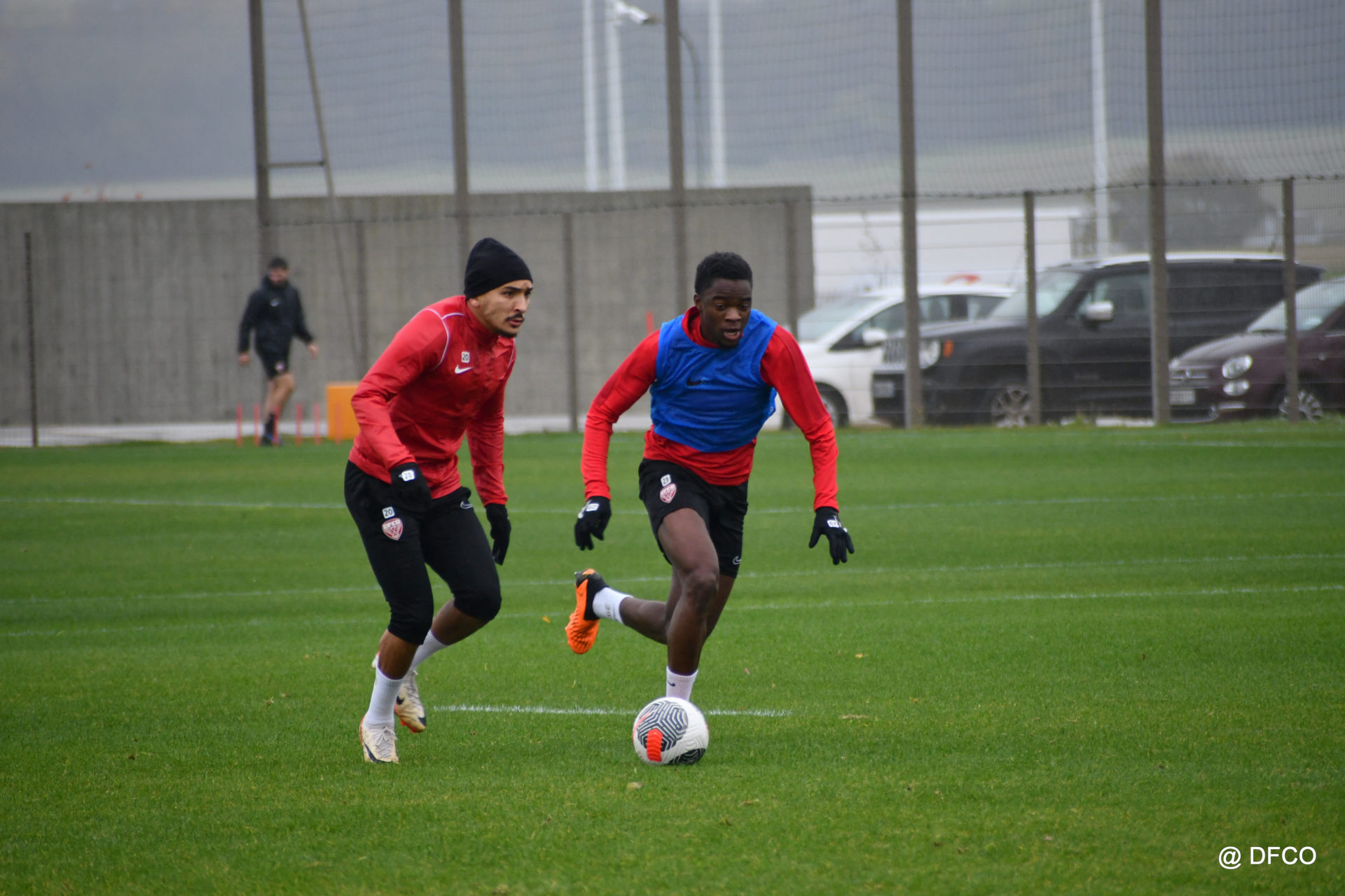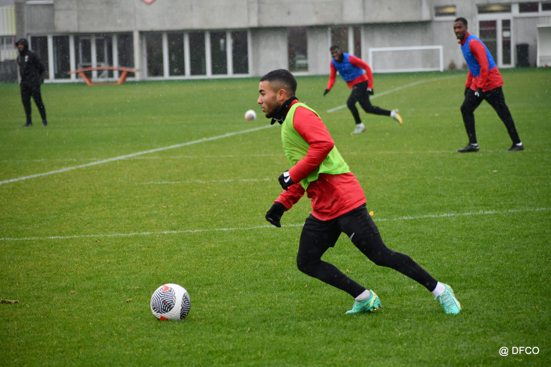 Après avoir partagé l’après-midi avec les participants du DFCO Tour by Crédit Mutuel (voir en cliquant ici), les Rouges ont retrouvé la pluie sur la séance matinale de jeudi, à deux jours de se déplacer sur la pelouse du RC Doullens, près d’Amiens, pour le compte du 7e tour de Coupe de France.