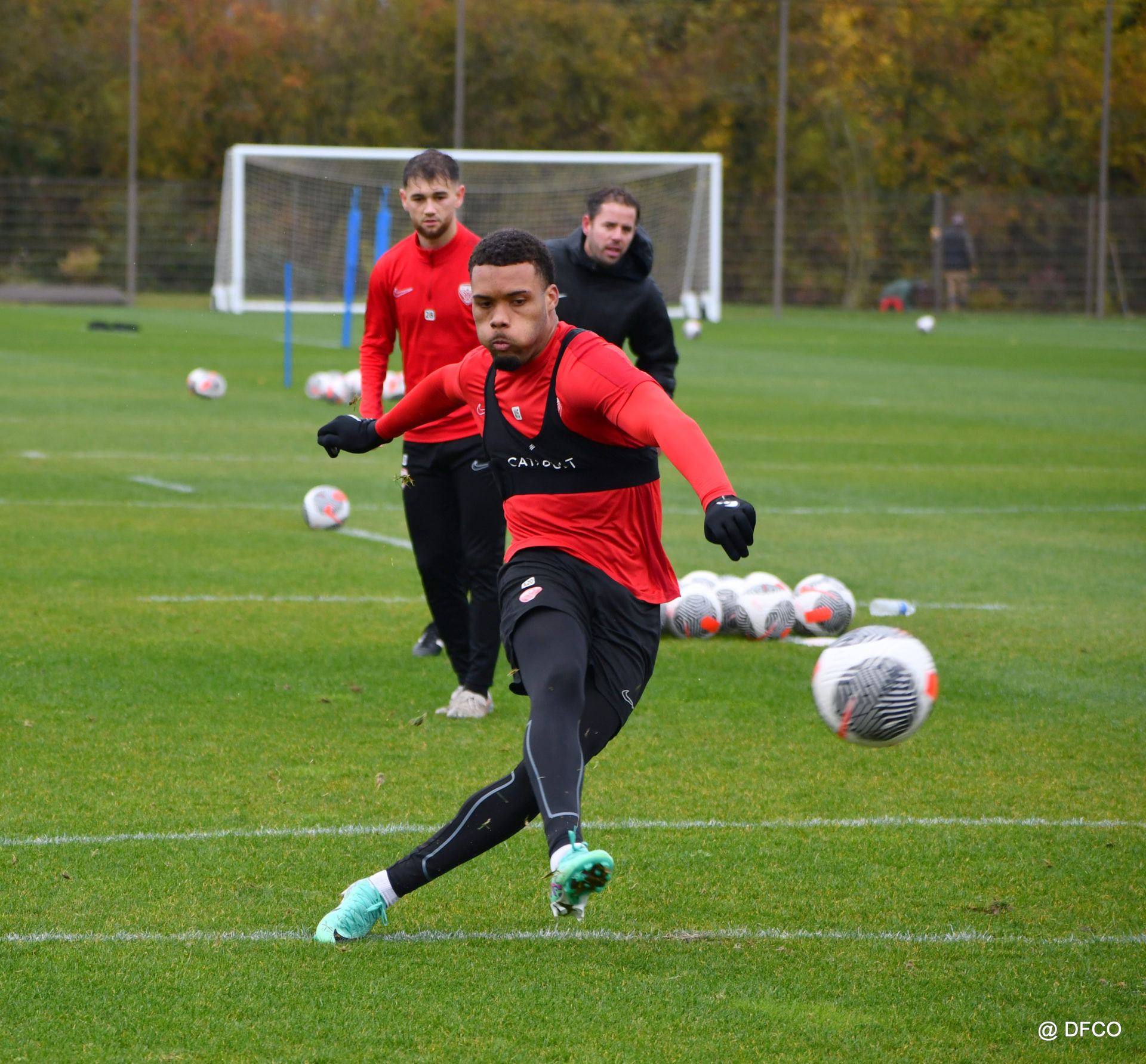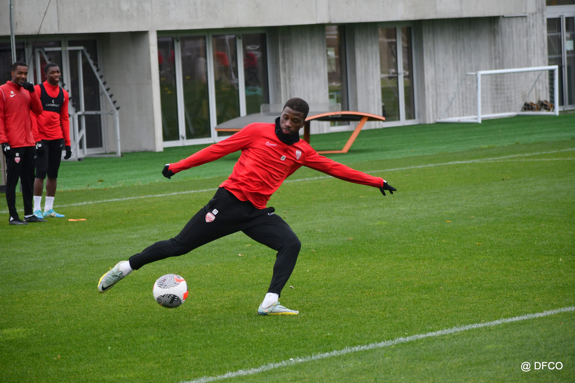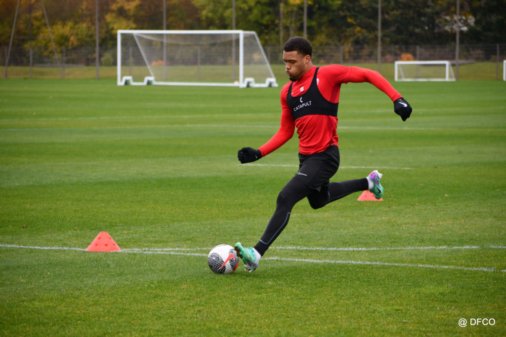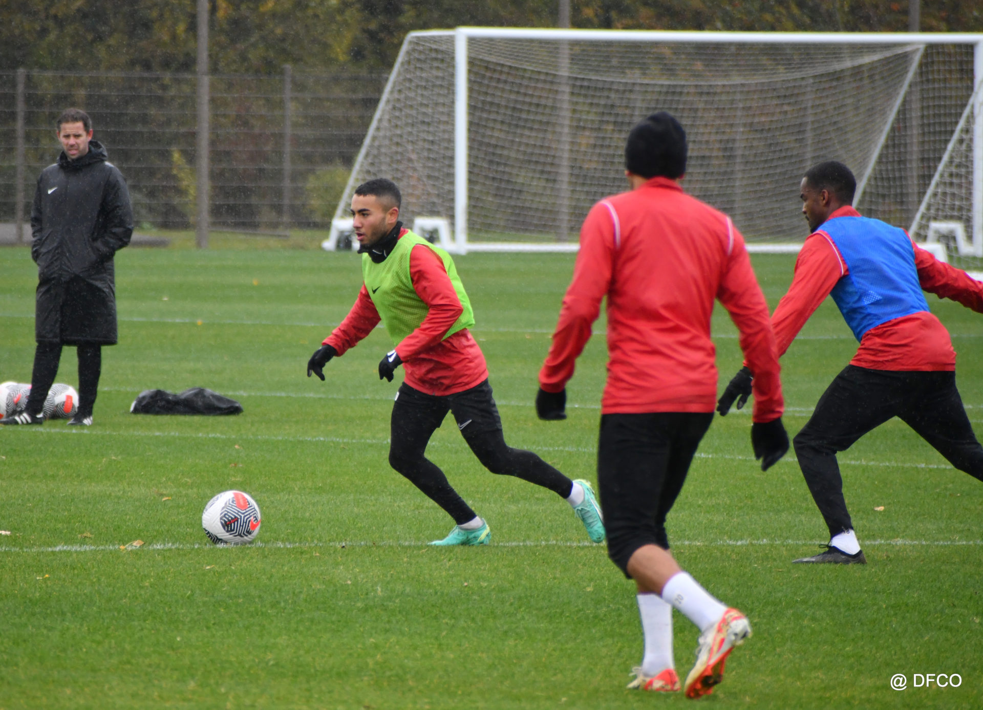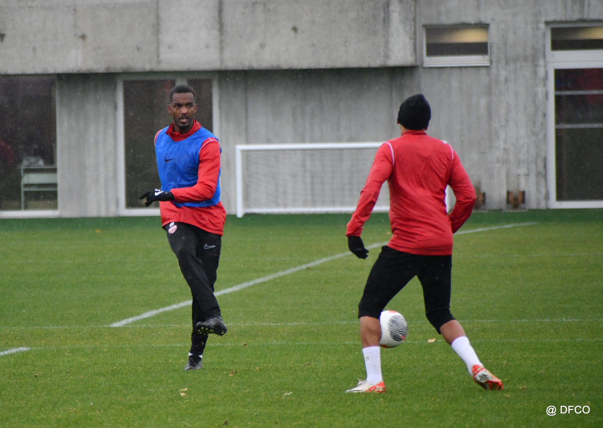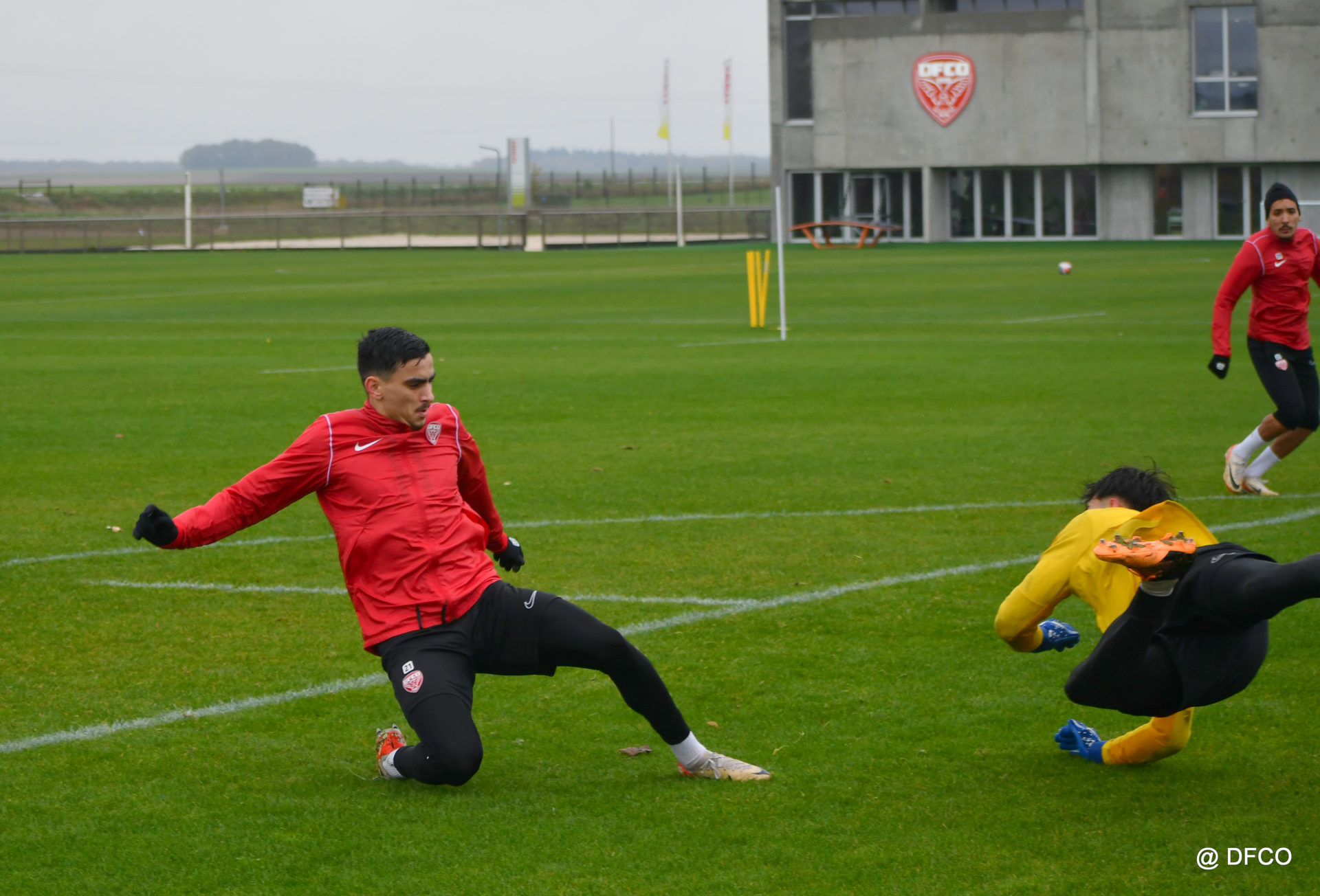 Après avoir partagé l’après-midi avec les participants du DFCO Tour by Crédit Mutuel (voir en cliquant ici), les Rouges ont retrouvé la pluie sur la séance matinale de jeudi, à deux jours de se déplacer sur la pelouse du RC Doullens, près d’Amiens, pour le compte du 7e tour de Coupe de France.