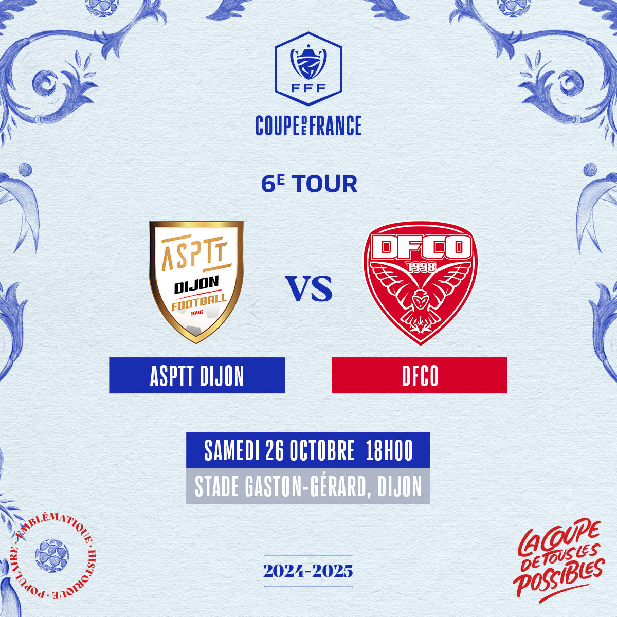 C’est officiel, le 6e tour de Coupe de France opposant le DFCO à l’ASPTT Dijon aura lieu le samedi 26 octobre au stade Gaston-Gérard. Le coup d’envoi sera donné à 18h00.