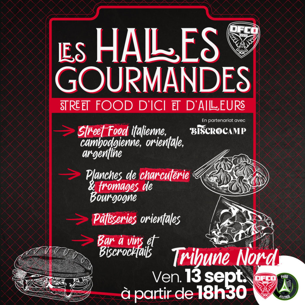 Une Halle Gourmande est installée en Tribune Nord avec des découvertes gastronomiques du monde entier. L’espace est animé par un DJ à chaque rencontre.