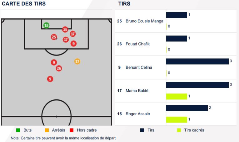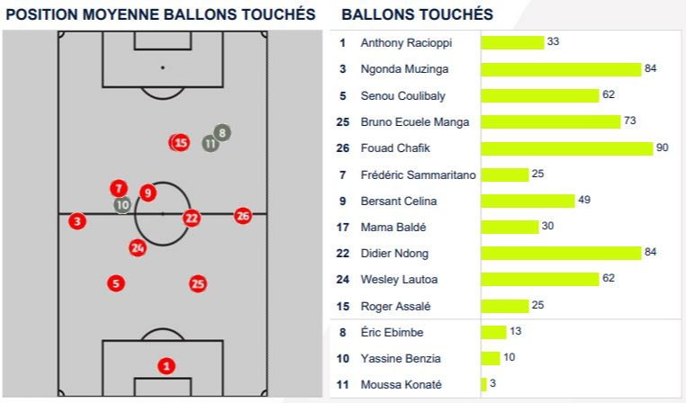 - Fouad Chafik (90), Brendan Chardonnet (88), Didier Ndong et Glody Ngonda (84) sont les quatre joueurs ayant touché le plus de ballons.