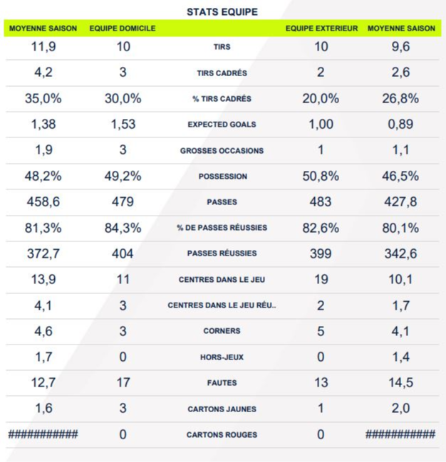 - Une possession du ballon quasiment égale entre les deux formations et un pourcentage de passes réussies un peu supérieur pour le Stade Brestois. Les hommes d'Olivier Dall'Oglio ont marqué 3 buts sur 3 frappes cadrées.