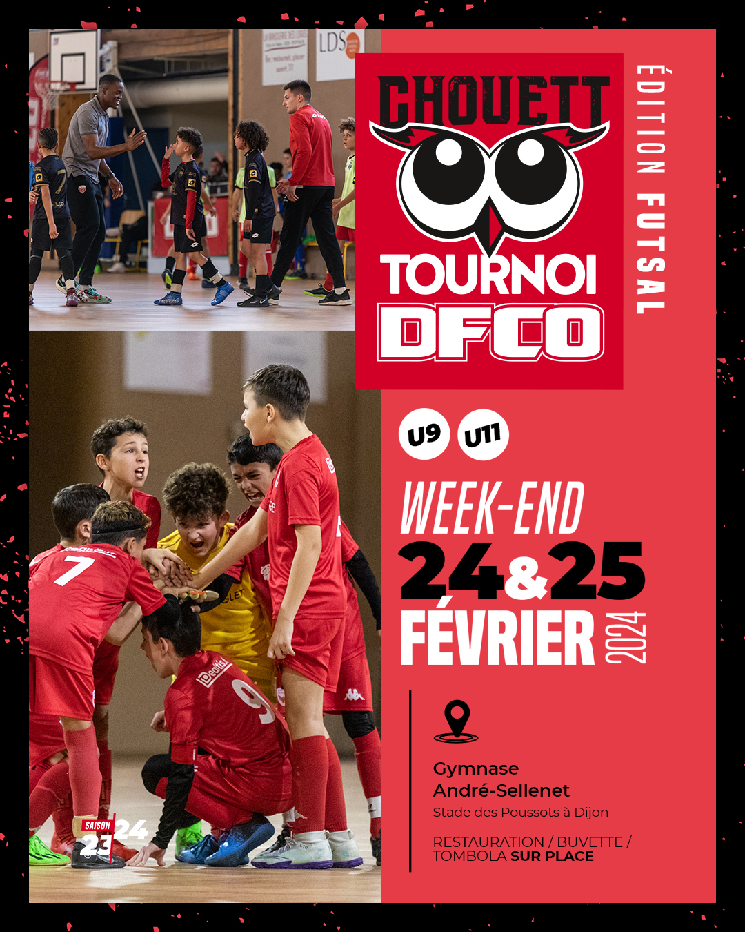 Le DFCO sera de retour au stade des Poussots les 24 et 25 février prochains ! Au gymnase André Sellenet, 20 équipes U9 (le samedi) et 16 équipes U11 (le dimanche) tenteront de remporter cette compétition en salle ! Mais prendre du plaisir sera l’objectif principal de ce beau week-end de football. *