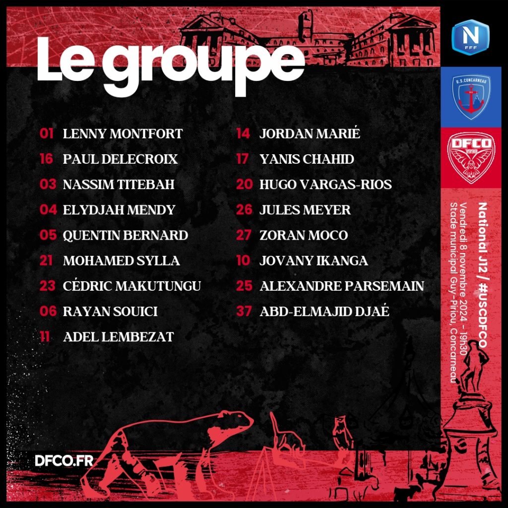 Pour le compte de la 12e journée de National, le DFCO se déplacera ce vendredi soir (19h30) sur la pelouse de l’US Concarneau. Baptiste Ridira et son staff ont composé un groupe de 17 joueurs.
