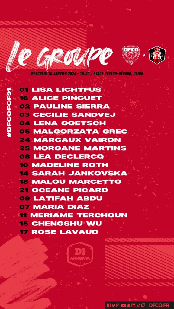 Pour le compte de la douzième journée de D1 Arkema, le DFCO recevra Fleury ce mercredi à 18h30. Voici le groupe concocté par Sébastien Joseph et son staff.