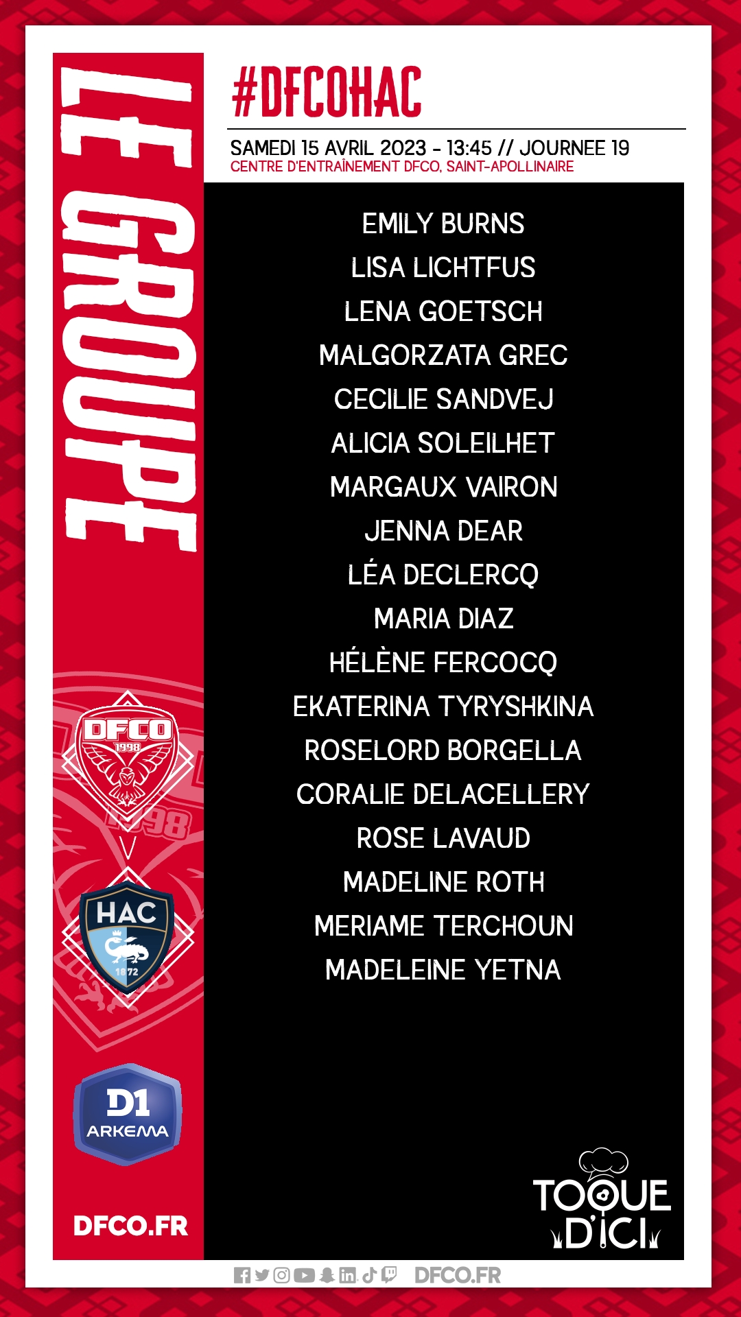 Pour le compte de la 19e journée de Division 1 Arkema, le DFCO reçoit le Havre ce samedi (13h45). Voici le groupe concocté par Sébastien Joseph et son staff.