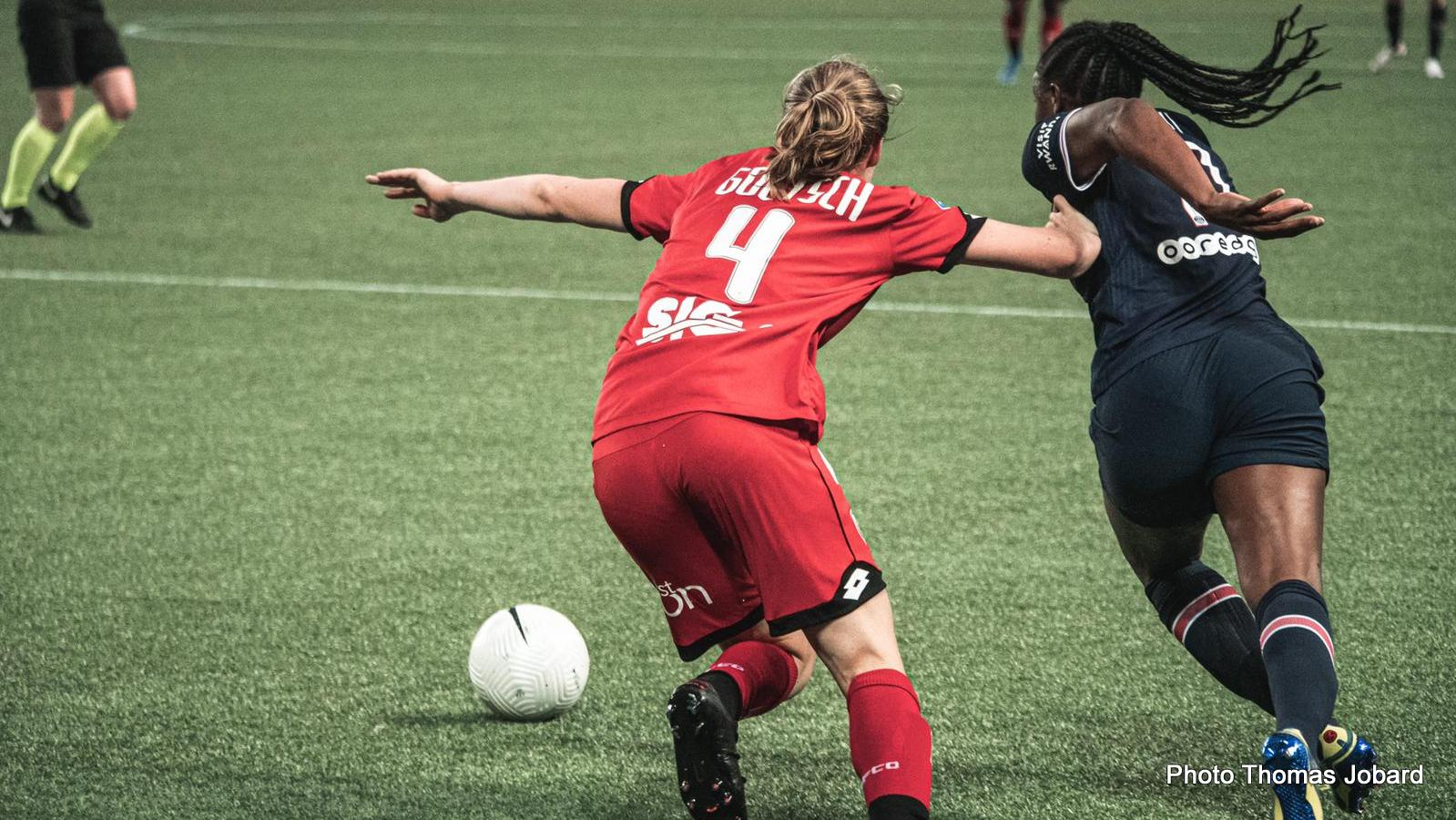 Le DFCO peine à se montrer dangereux, même si Ophélie Cuynet aurait pu être menaçante en négociant mieux, de la tête, un coup-franc de Léa Declercq (40'). La réaction du PSG est immédiate avec plusieurs occasions de breaker avant la pause signées Diani (41') puis Bachmann qui frappe à deux reprises sur les poteaux.