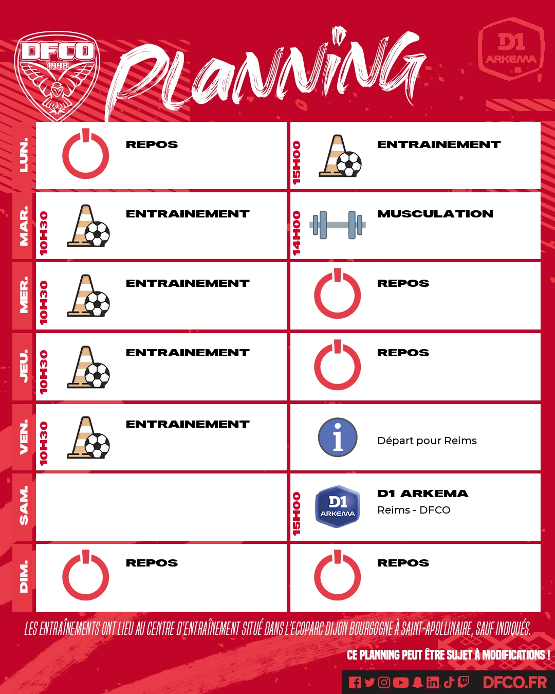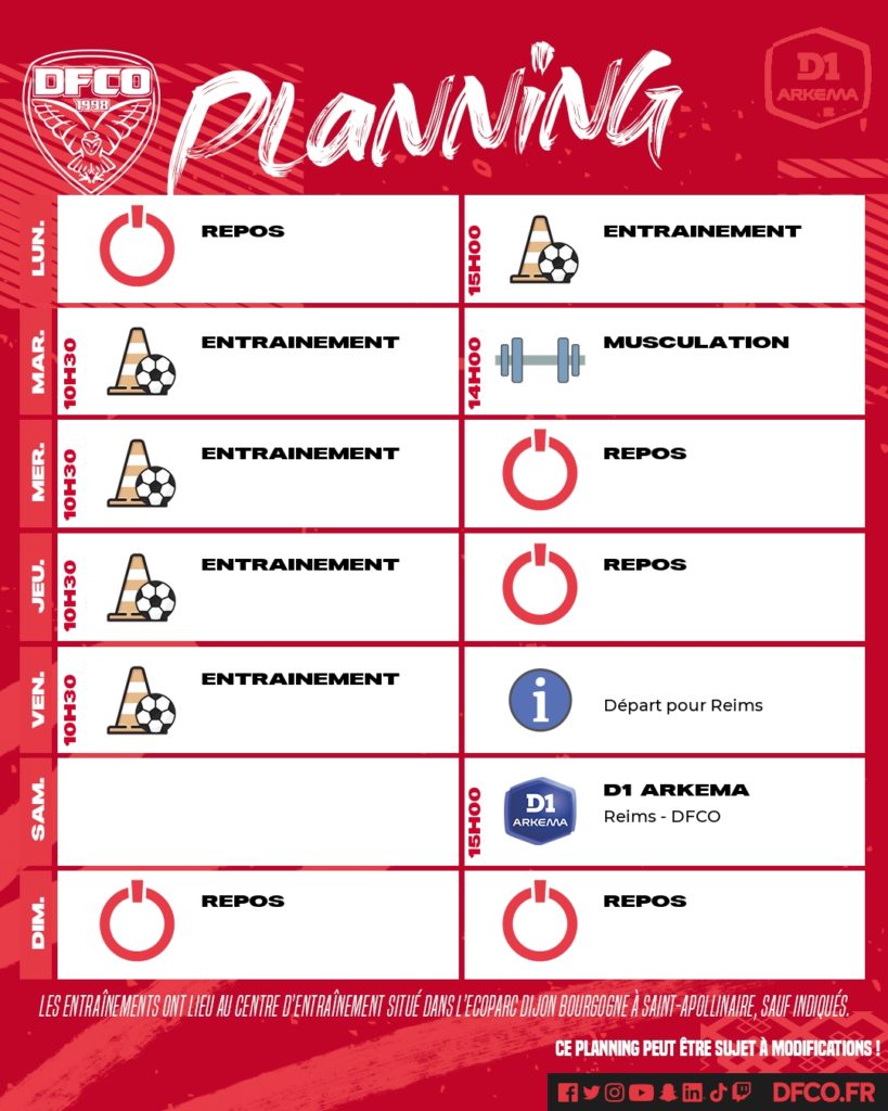 Après le nul spectaculaire face au LOSC (3-3), notre équipe féminine effectuera un déplacement à Reims samedi prochain (15h00, 3e journée de D1 Arkema). Voici le planning des entraînements.
