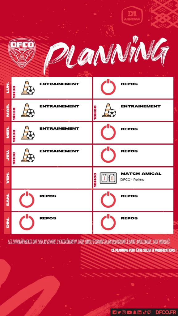 Après son premier match amical remporté 3-0 contre Strasbourg, le DFCO attaque une nouvelle semaine de préparation avec un nouveau match test, cette fois contre le Stade de Reims vendredi (18h00) à Troyes. Voici le planning des entraînements cette semaine.