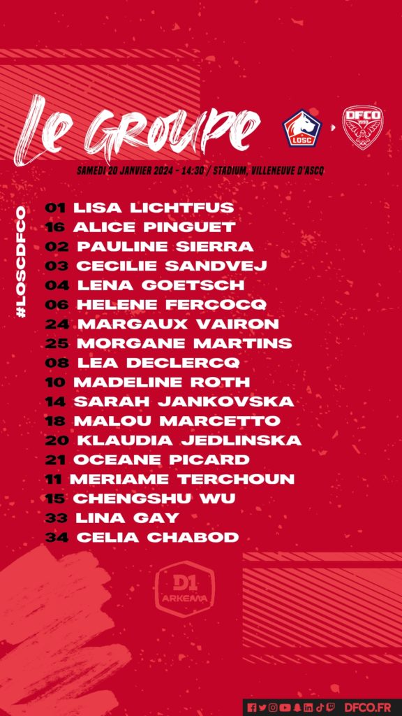 Pour le compte de la treizième journée de D1 Arkema, le DFCO se déplace à Lille ce samedi à 14h30. Voici le groupe concocté par Sébastien Joseph et son staff.