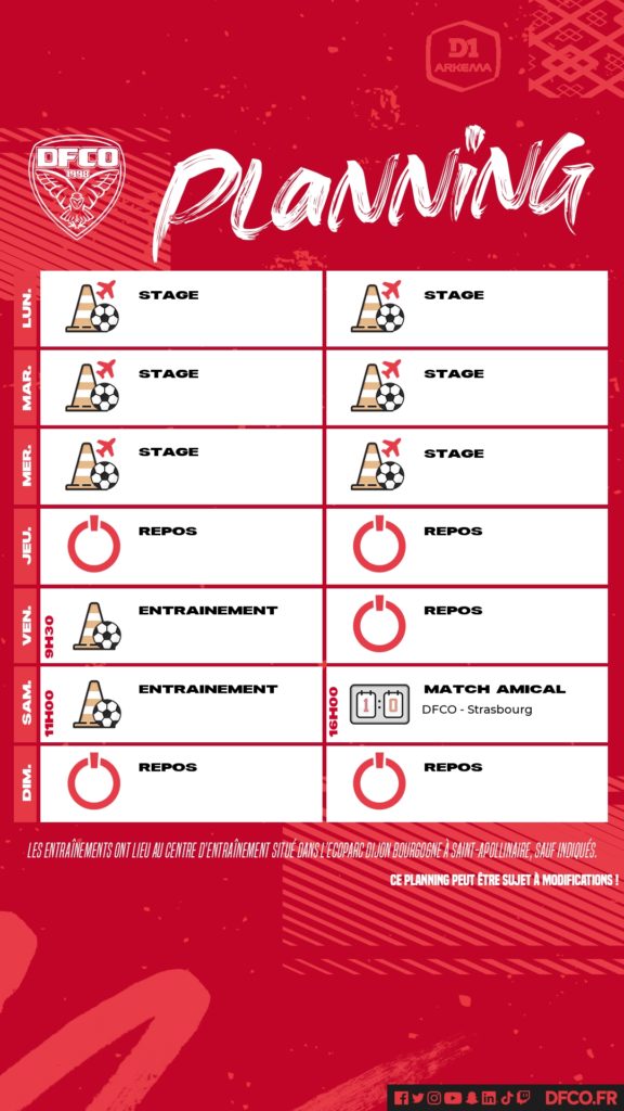 Le DFCO a débuté son stage à Hauteville et conclura la semaine par un match amical contre Strasbourg à Phalsbourg (16h00). Retrouvez le planning complet !