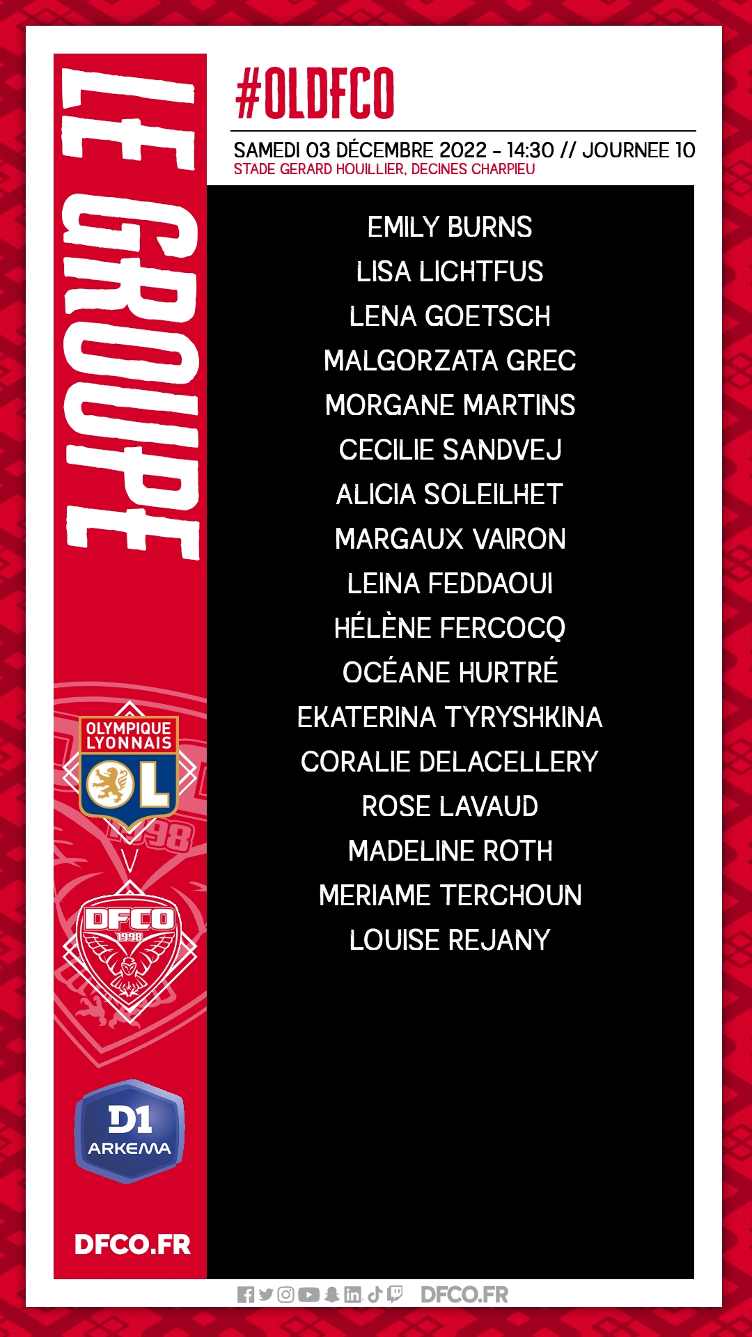 Pour le compte de la 10e journée de D1 Arkema, le DFCO se déplace à Lyon ce samedi (coup d’envoi 14h30). Christophe Forest et son staff ont convoqué un groupe de 17 joueuses.