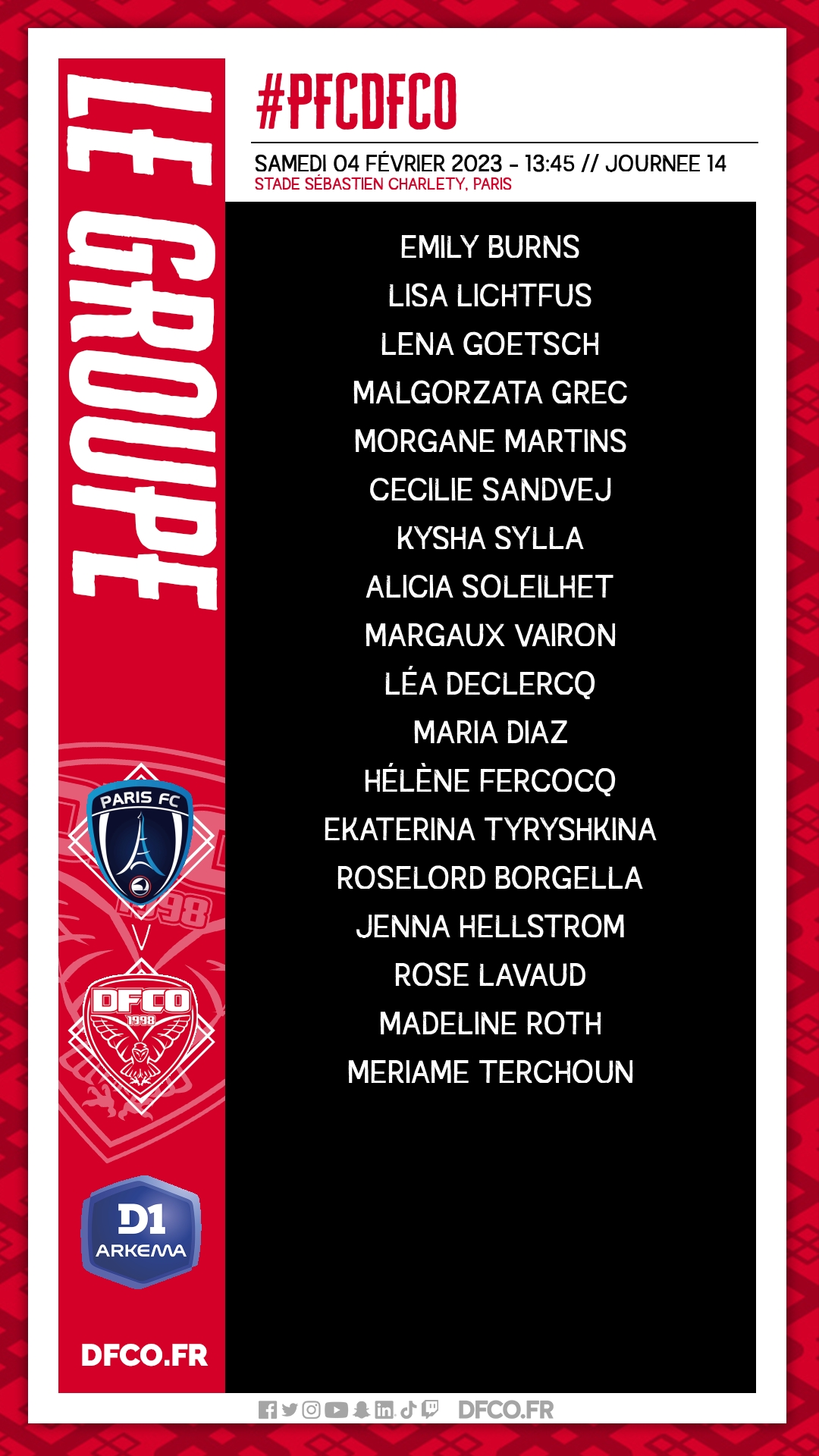 Pour le compte de la 14e journée de Division 1 Arkema, le DFCO se déplace au Paris FC, ce samedi (13h45). Voici le groupe concocté par Sébastien Joseph et son staff.