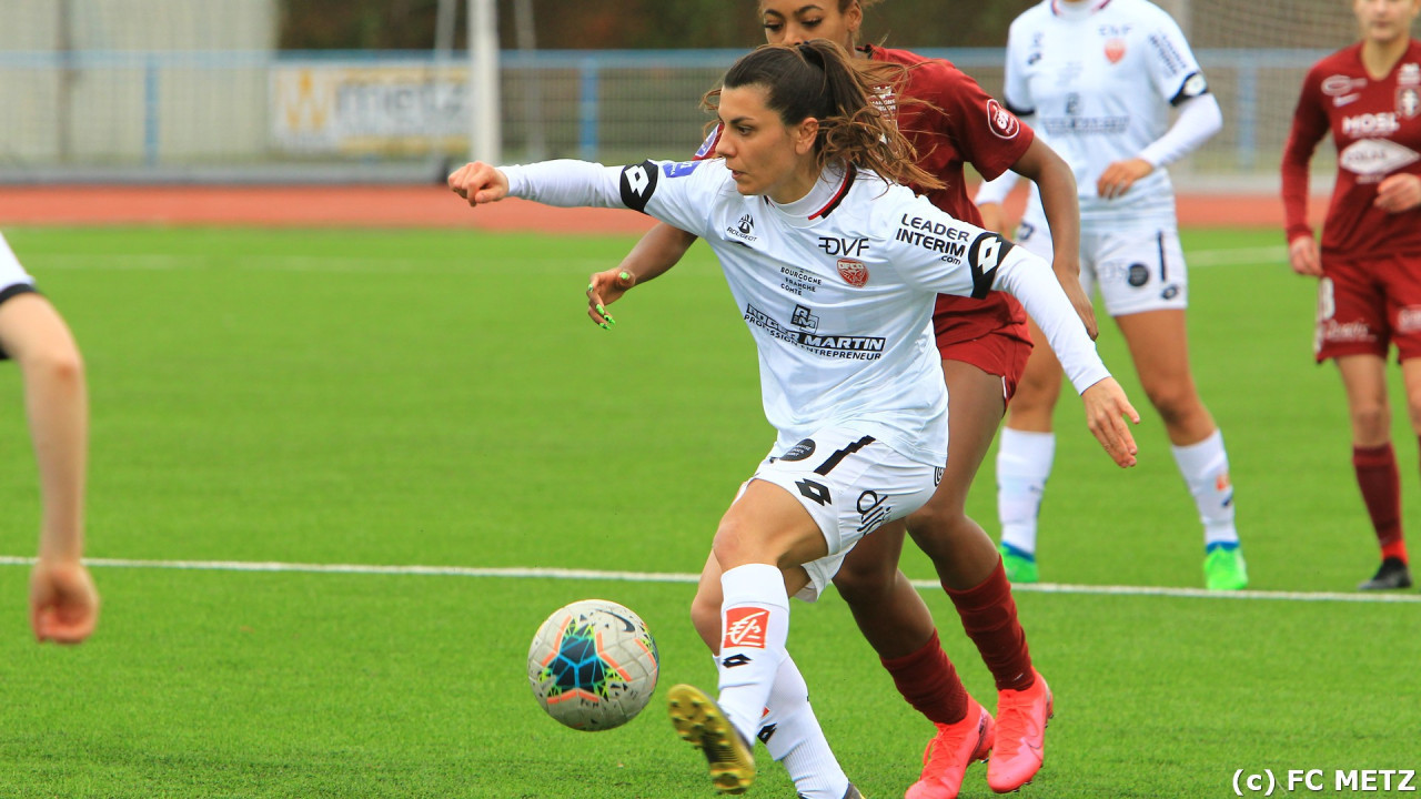 Les Messines sont les premières à se créer une occasion dans ce match dès le coup d'envoi. Suite à un débordement de Gordon, les locales obtiennent un corner. Rougemont place alors une tête qui est repoussée par Elise Bussaglia (1'). Mais ce sont bien les Dijonnaises qui vont se montrer les plus dangereuses. Léa Declercq place une lourde frappe qui oblige Lerond à détourner en corner (3'). Dans la foulée, Carol Rodrigues est à deux doigts de reprendre une remise en retrait de Tatiana Solanet (4'). La prochaine occasion chaude est la bonne. Sur coup-franc, Elise Bussaglia trouve Carol Rodrigues qui place sa tête pour tromper la gardienne messine (0-1, 5'). Mais dans la foulée du but dijonnais, Delabre égalise en reprenant de la tête un centre messin (1-1, 7'). La suite de cette première période voit les deux équipes poser le jeu et se procurer peu d'occasions. Gordon reprend un long ballon au second poteau d'une volée qui est détournée (13'). Le DFCO pousse et croit prendre l'avantage. Rose Lavaud sert Solène Barbance qui trompe Lerond, mais elle est signalée hors-jeu (28'). Le score reste le même. Après un corner, Grimshaw remet dans l'axe, Rougemont détourne le ballon vers Delabre qui place une tête hors du cadre (39'). La dernière occasion de cette première période est pour Delabre, qui tente une volée, mais Emmeline Mainguy est sur la trajectoire (43').