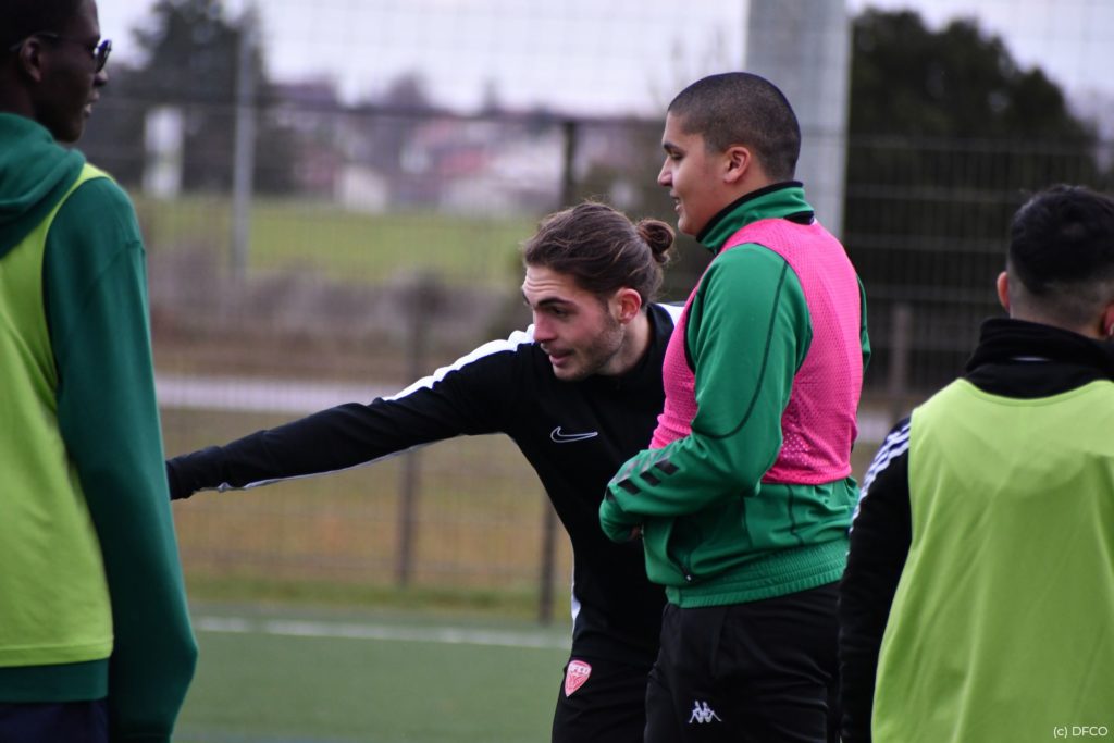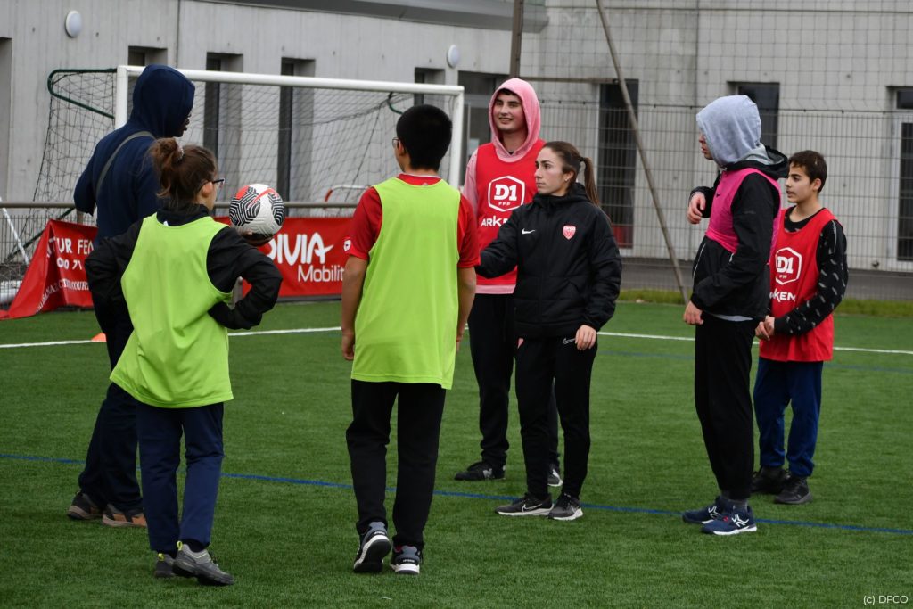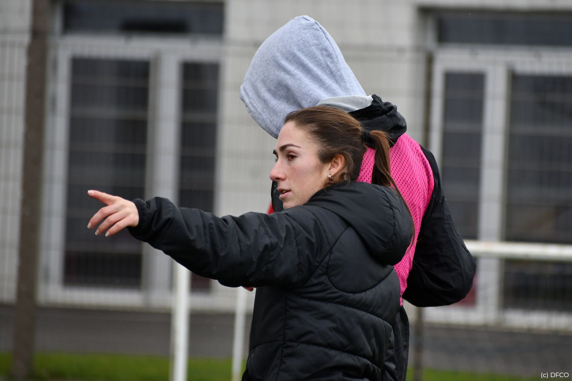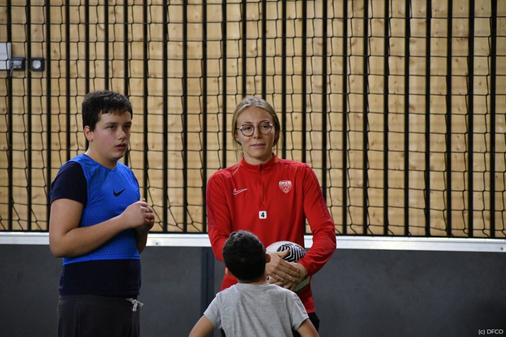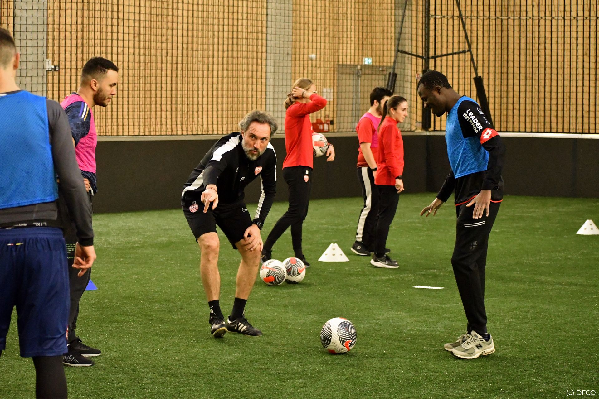 Lundi, Benoît Tavenot a souhaité se joindre à Léna Goetsch et Morgane Martins pour animer la séance. Exceptionnellement délocalisée sur le terrain de soccer du centre d’entraînement en raison du froid, elle a donné lieu à de jolis moments d’échange. Le coach des hommes a été rejoint par celui des femmes, Sébastien Joseph, au moment de la remise des maillots en fin de séance.