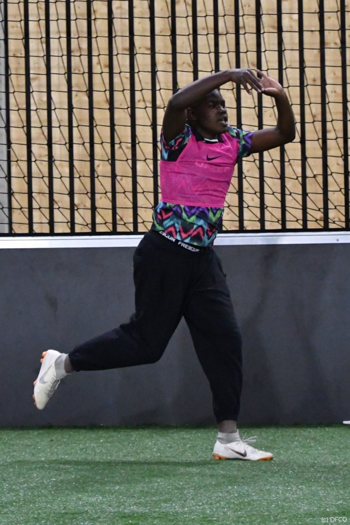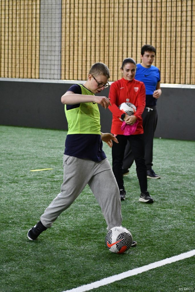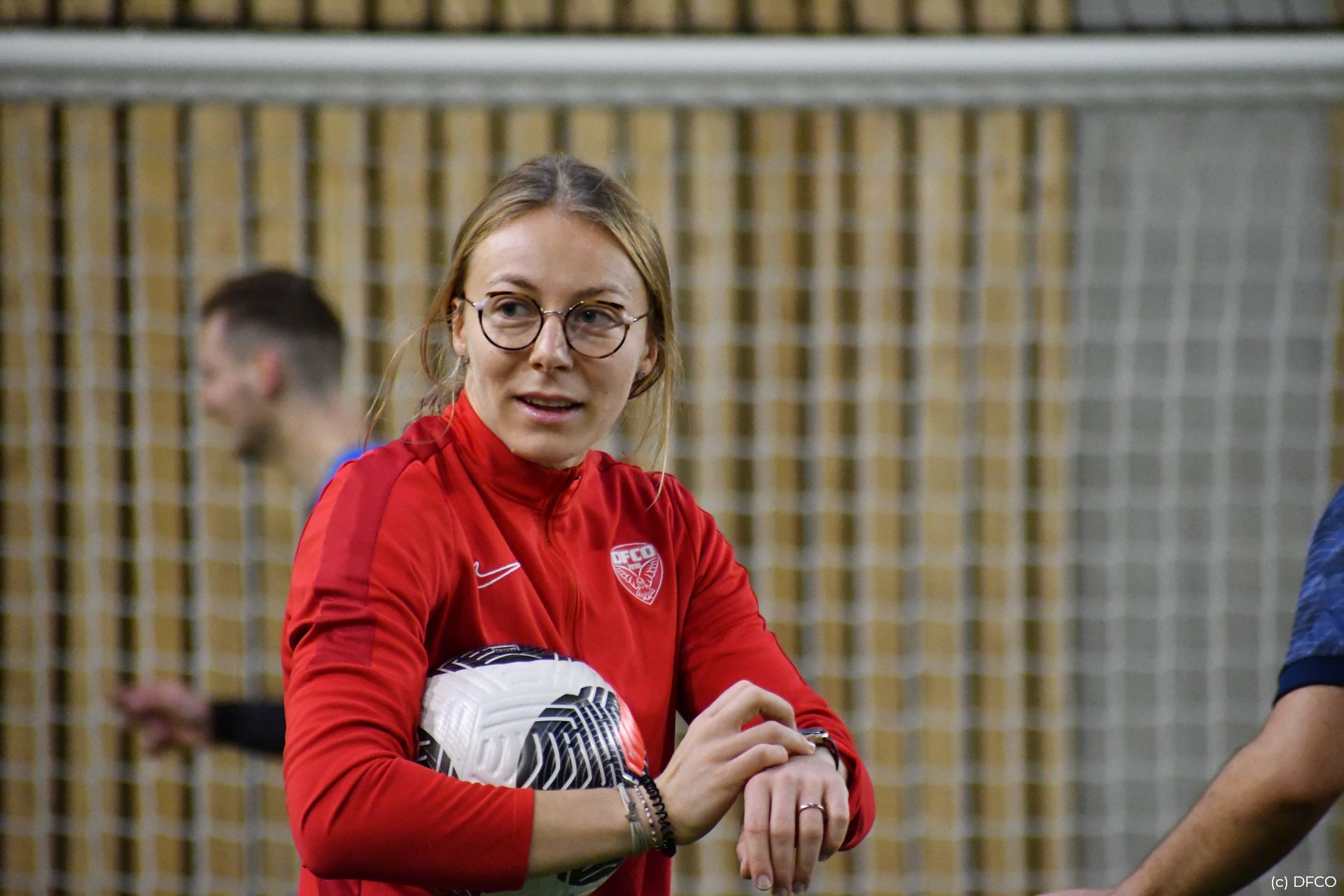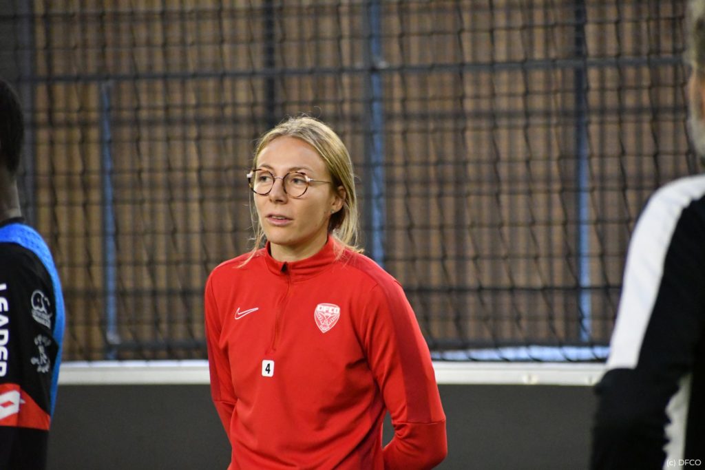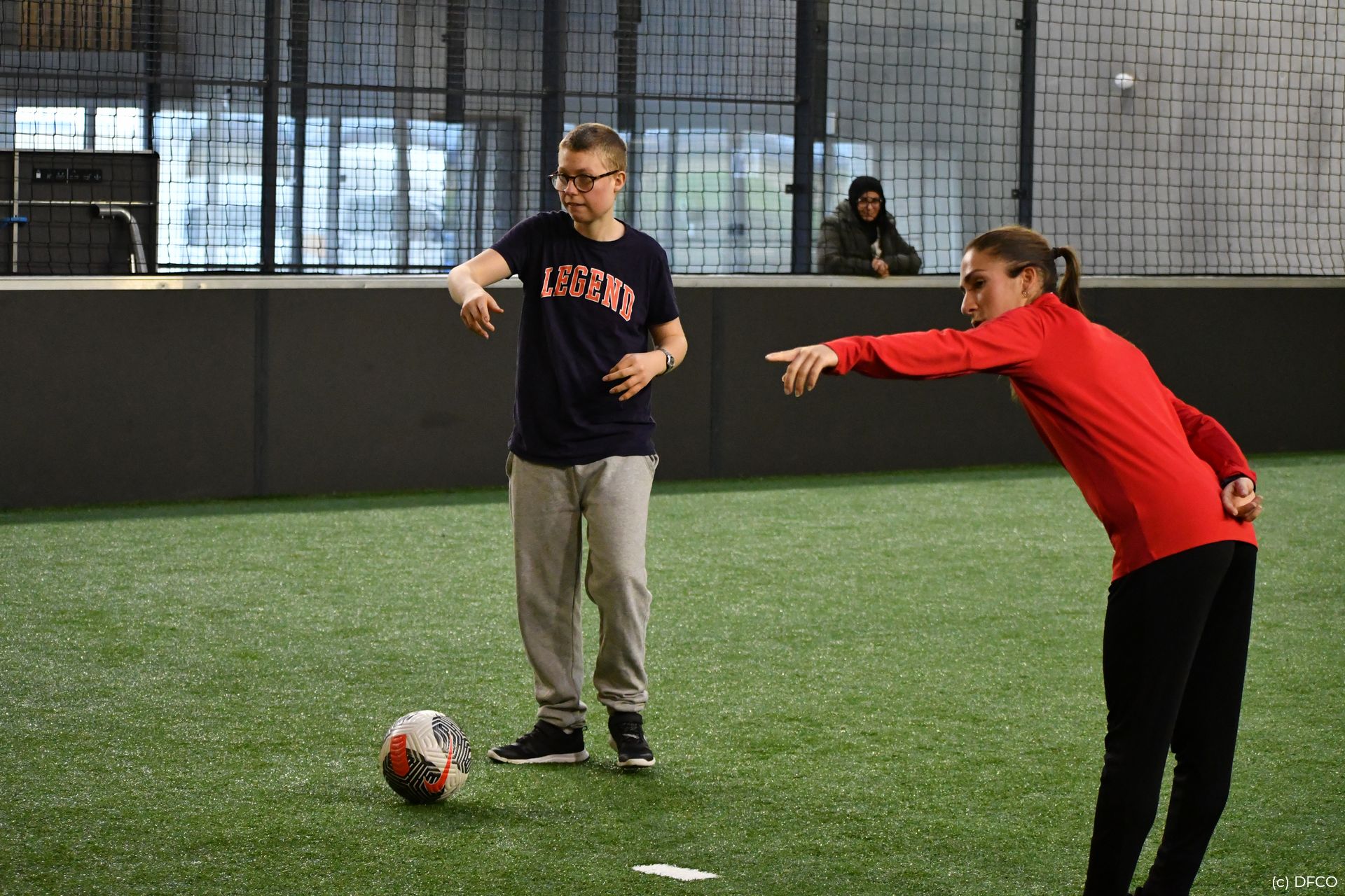 Lundi, Benoît Tavenot a souhaité se joindre à Léna Goetsch et Morgane Martins pour animer la séance. Exceptionnellement délocalisée sur le terrain de soccer du centre d’entraînement en raison du froid, elle a donné lieu à de jolis moments d’échange. Le coach des hommes a été rejoint par celui des femmes, Sébastien Joseph, au moment de la remise des maillots en fin de séance.