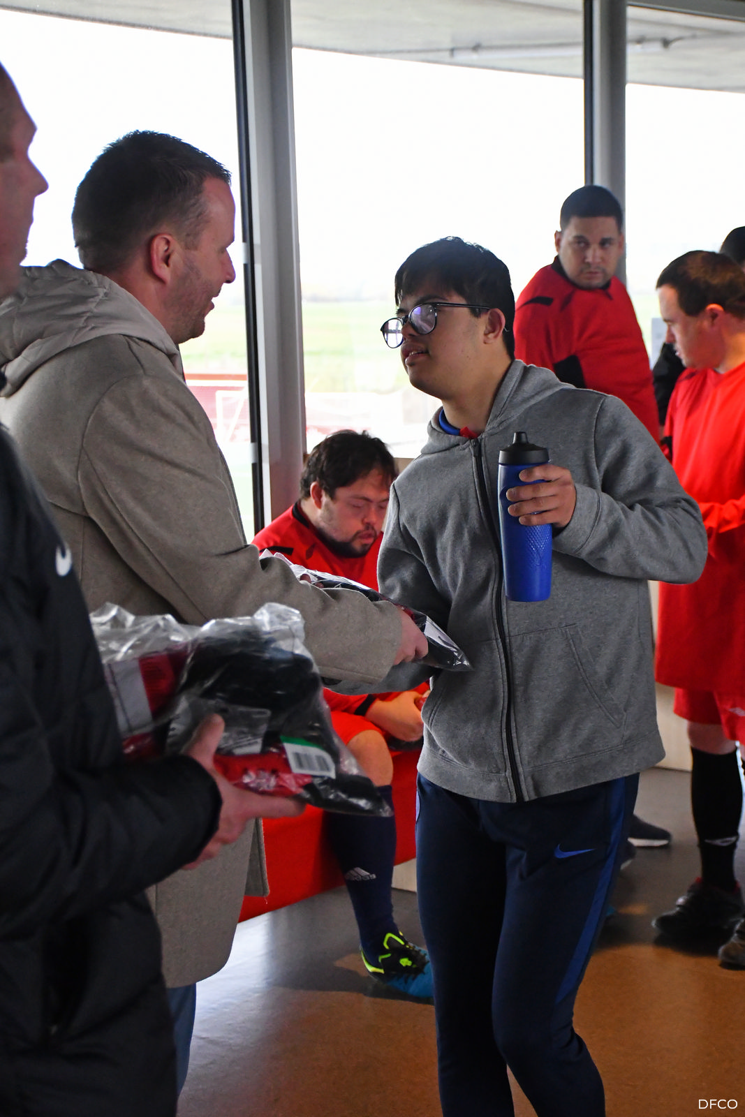 Les joueurs venus des différents établissements médico-sociaux du département se sont vu remettre une tenue complète d’entraînement maillot, short et chaussettes Nike des mains des coachs Baptiste Ridira (National), Sébastien Joseph (Arkema Première Ligue) et Pierre-Alain Picard (adjoint Arkema Première Ligue) ainsi que du Directeur sportif de la section féminine Sylvain Carric.