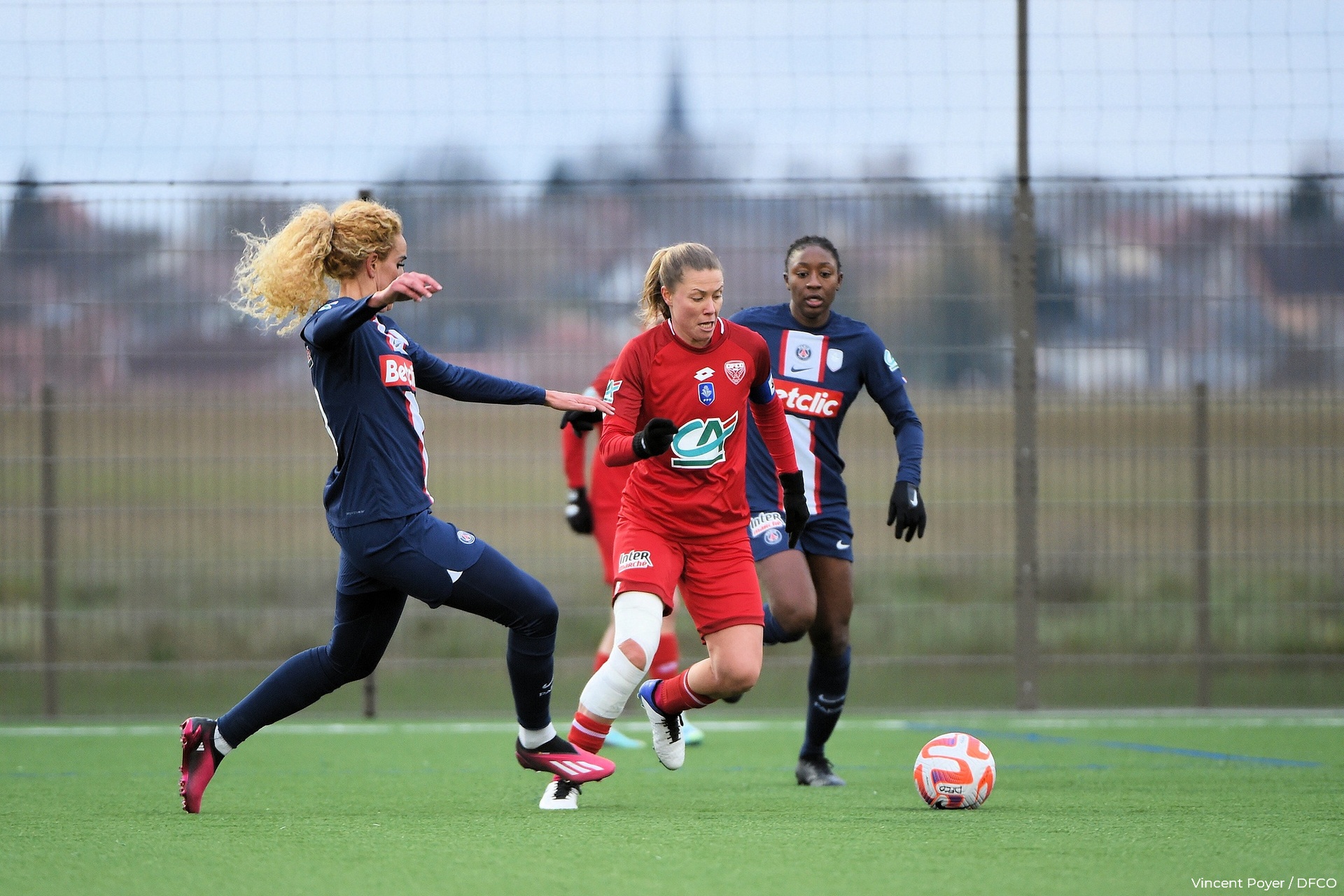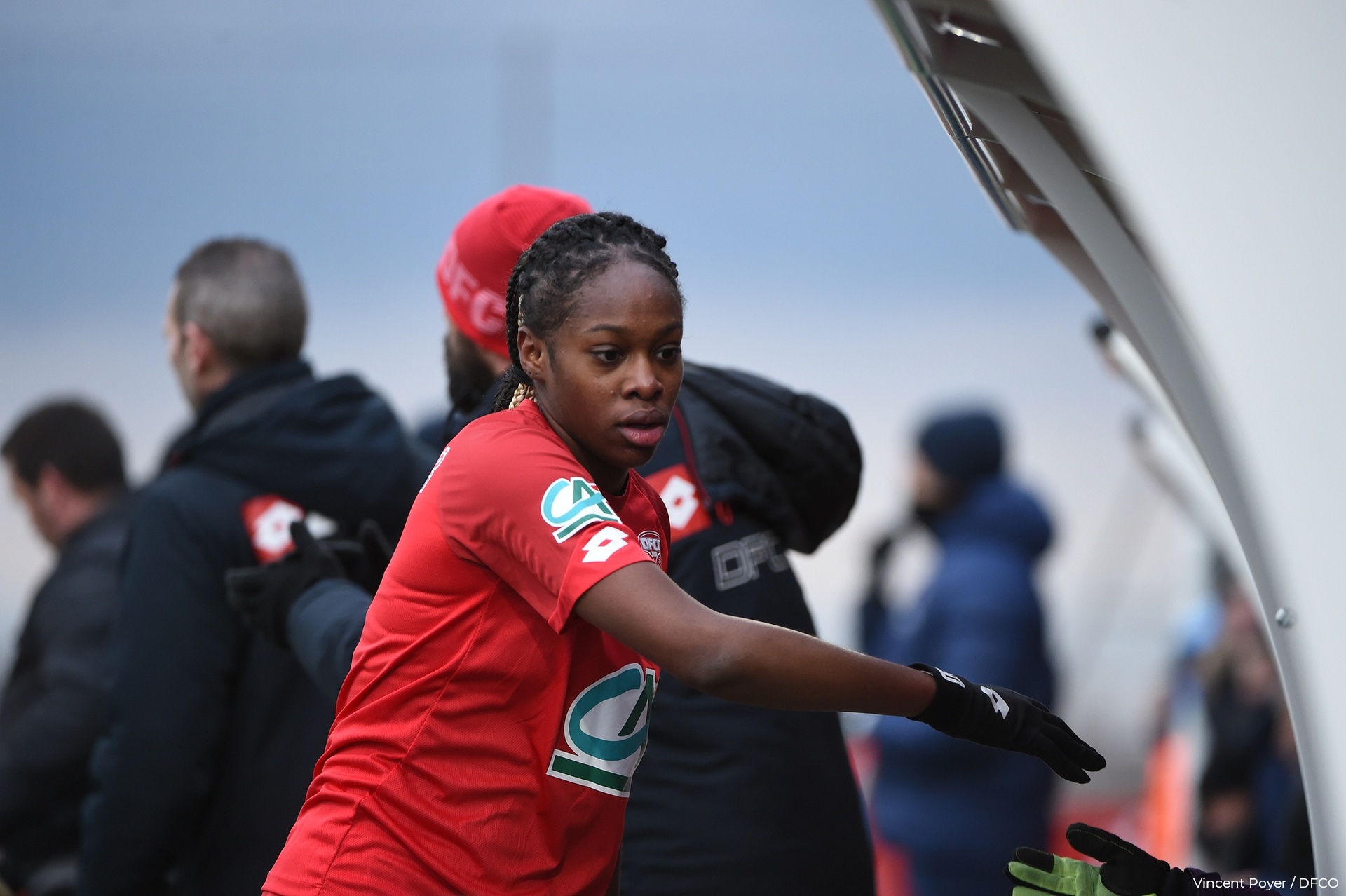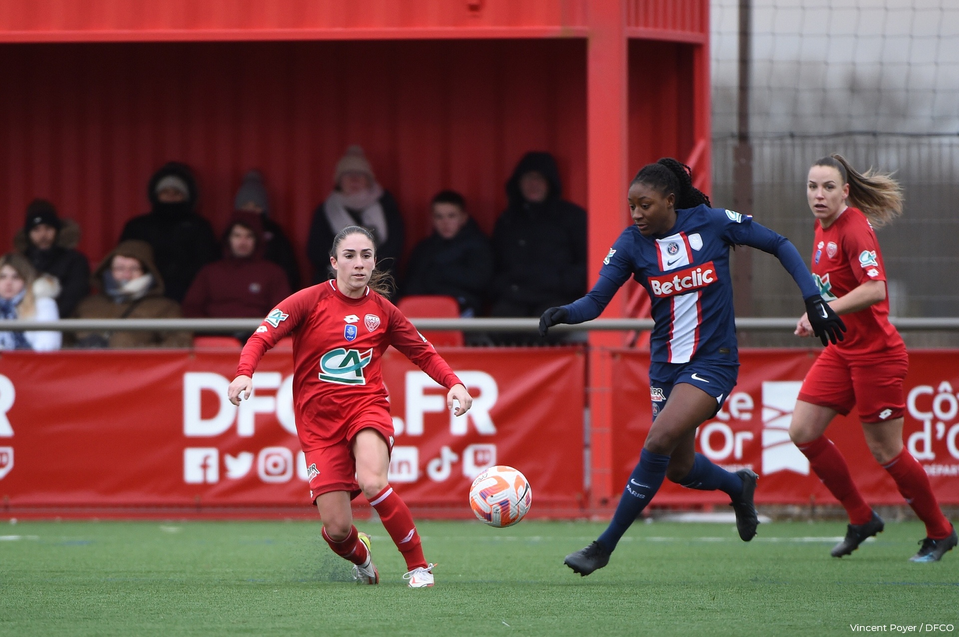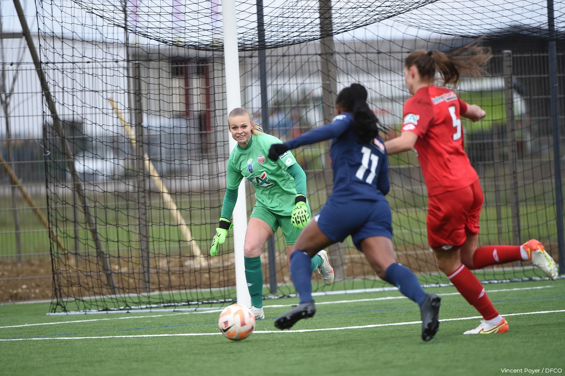 Vraiment bien en place dans sa première période, le DFCO fait mieux que résister et parvient ponctuellement à se montrer dangereux. Roselord Borgella, bien lancée par Morgane Martins trouve une position de frappe. Contrée au départ, sa tentative retombe à côté des buts parisiens. Le corner ne donne rien (40’).