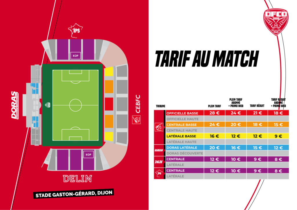 Notre billetterie en ligne est ouverte 24h/24 et 7j/7. Vous avez aussi la possibilité d’acheter vos places au DFCO Store (lundi au vendredi, 9h-12h / 14h/18h).