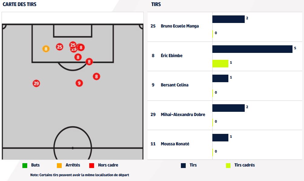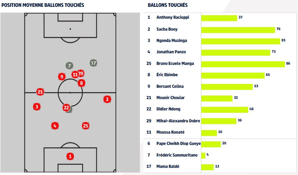 - Bruno Ecuele Manga est le joueur ayant le plus touché de ballons (86), suivi du Monégasque Benoit Badiashile (84) et de Glody Ngonda (81). Au niveau plus offensif, Éric Junior Dina Ebimbe a touché 65 ballons.