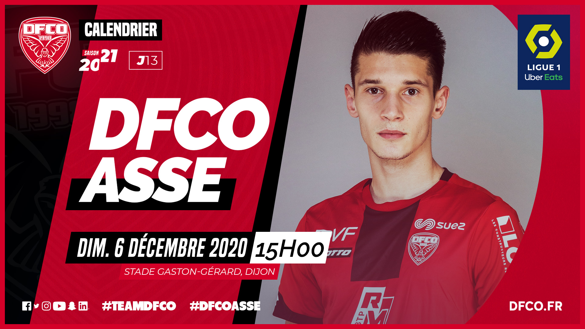 La LFP a annoncé la programmation de la 13e journée de Ligue 1 Uber Eats. Le DFCO accueillera l'AS Saint-Etienne le dimanche 6 décembre à 15h00.