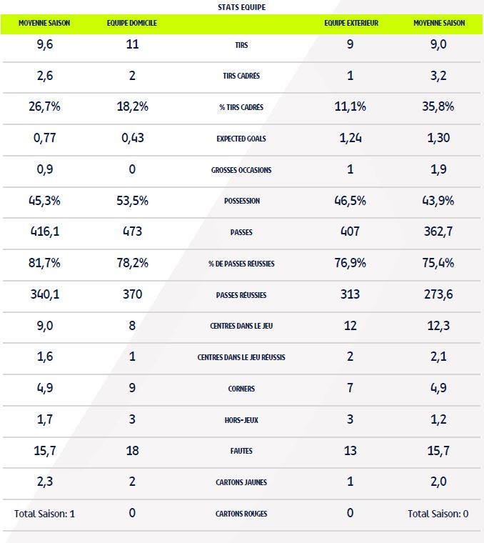 - Pas mal de déchet technique dimanche sur la pelouse de Gaston-Gérard, c'est ce que confirment les statistiques (78,2 % et 76,9 % de passes réussies).