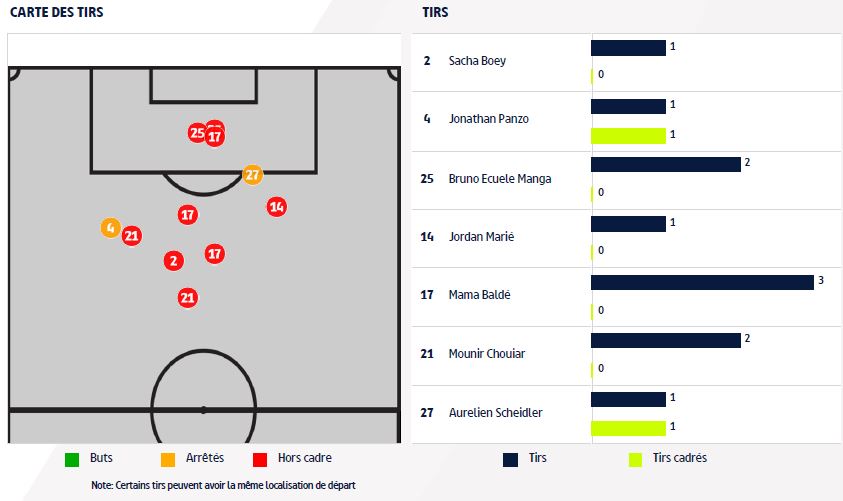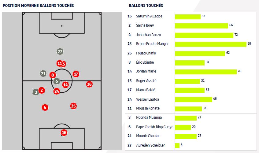 - Bruno Ecuele Manga est le joueur ayant touché le plus de ballons au cours de la rencontre (88), suivi de Jordan Marié (76) et du Lorientais Andreaw Gravillon (76).