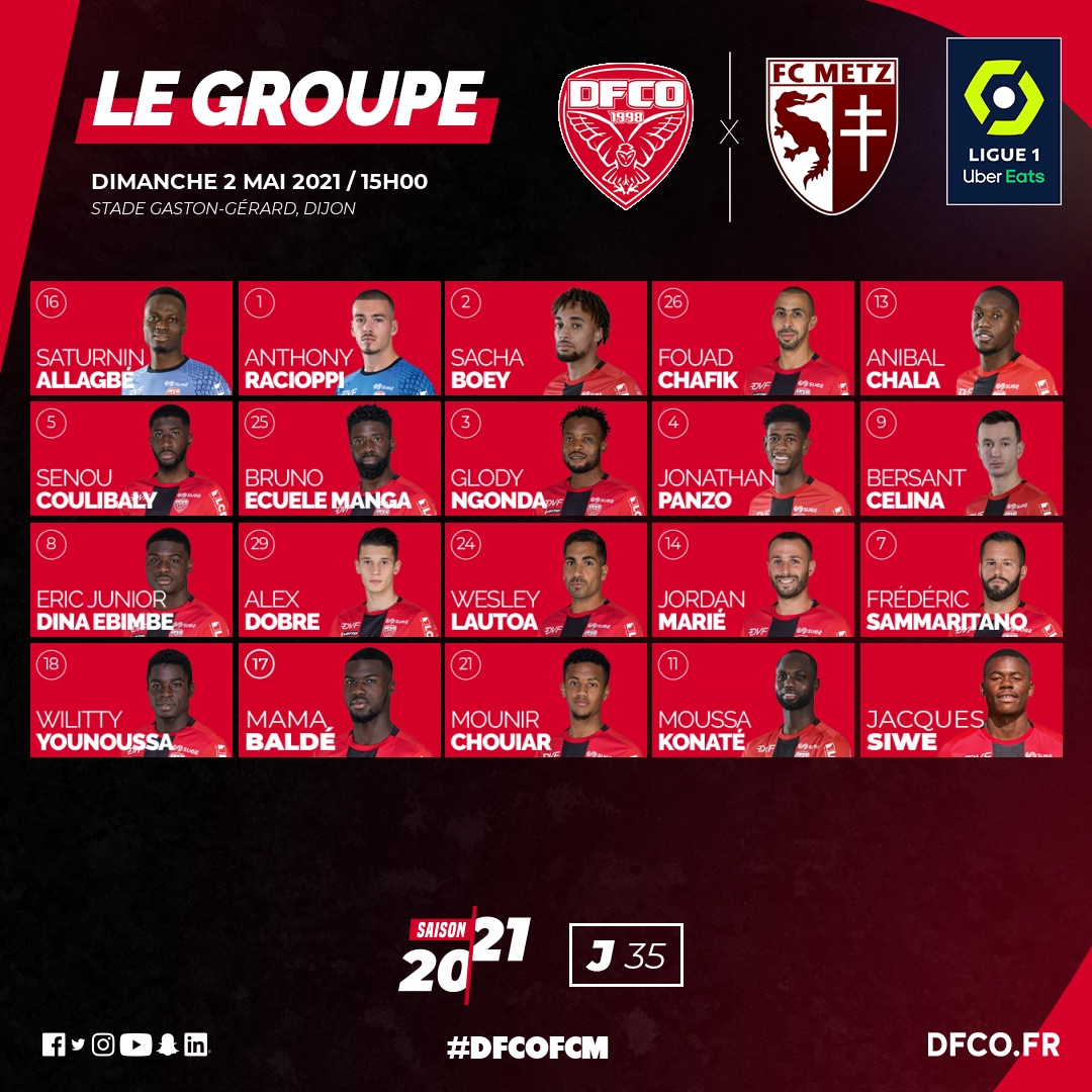 Pour affronter le FC Metz au stade Gaston-Gérard ce dimanche (15h00 / 35e journée de Ligue 1 Uber Eats), David Linarès et son staff ont convoqué un groupe de 20 joueurs.