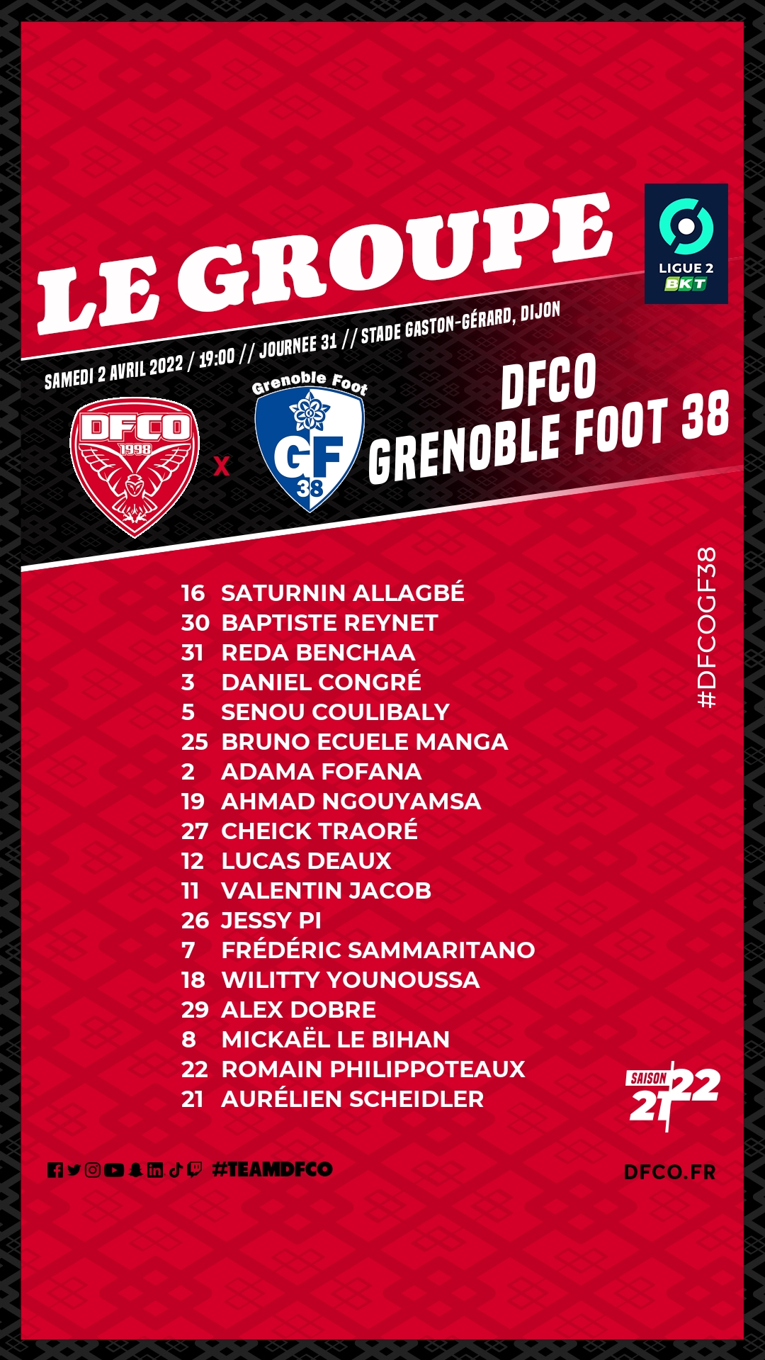 Un groupe de 18 joueurs est convoqué par Patrice Garande et son staff pour le match opposant le DFCO à Grenoble (31e journée de Ligue 2 BKT / 19h00).