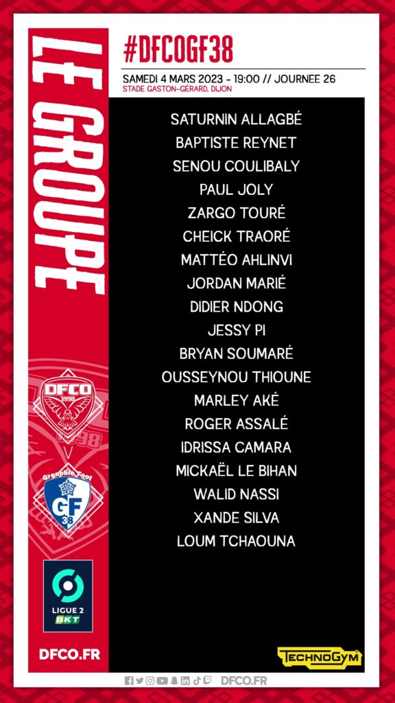 Pour le compte de la 26e journée de Ligue 2 BKT, le DFCO accueille Grenoble samedi au stade Gaston-Gérard. Pour ce rendez-vous, Omar Daf et son staff ont convoqué un groupe de 19 joueurs.