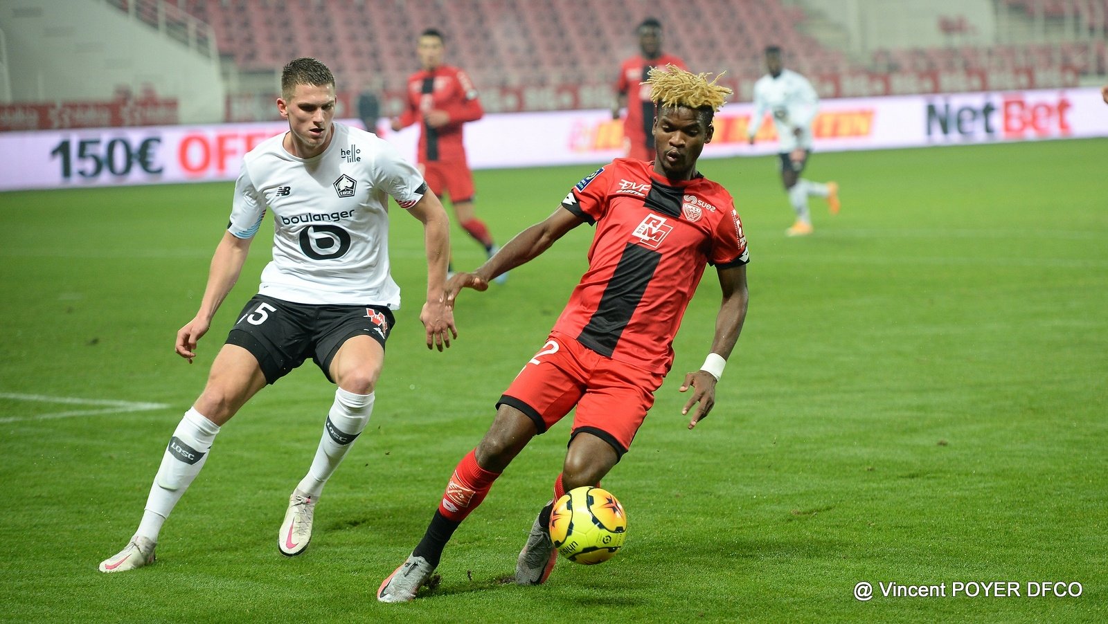 Le DFCO a beaucoup de mal à enchaîner les passes et à développer son jeu face à des Lillois vraiment bien en place et impressionnant dans tous les domaines. On a l’impression que chaque perte de balle peut être punie... C’est ce qui a failli arriver quand David, plein axe, a fixé la défense puis servi Ikoné sur sa droite. Heureusement, ce dernier manque son dernier geste – une tentative de frappe piquée – et par la même occasion le cadre (31’). Petit à petit, les offensives lilloises deviennent moins tranchantes et surtout le DFCO parvient à hausser son niveau de jeu jusqu’à la mi-temps. Bersant Celina se créera une bonne opportunité sur une frappe croisée qui n’attrape pas le cadre (35’), même s’il aurait été intéressant de le voir servir Moussa Konaté, seul dans la surface. Les coéquipiers de Didier Ndong, qui jouait son 100e match de Ligue 1 ce soir, sont présents dans le combat, mais la qualité technique lilloise fait souvent la différence.