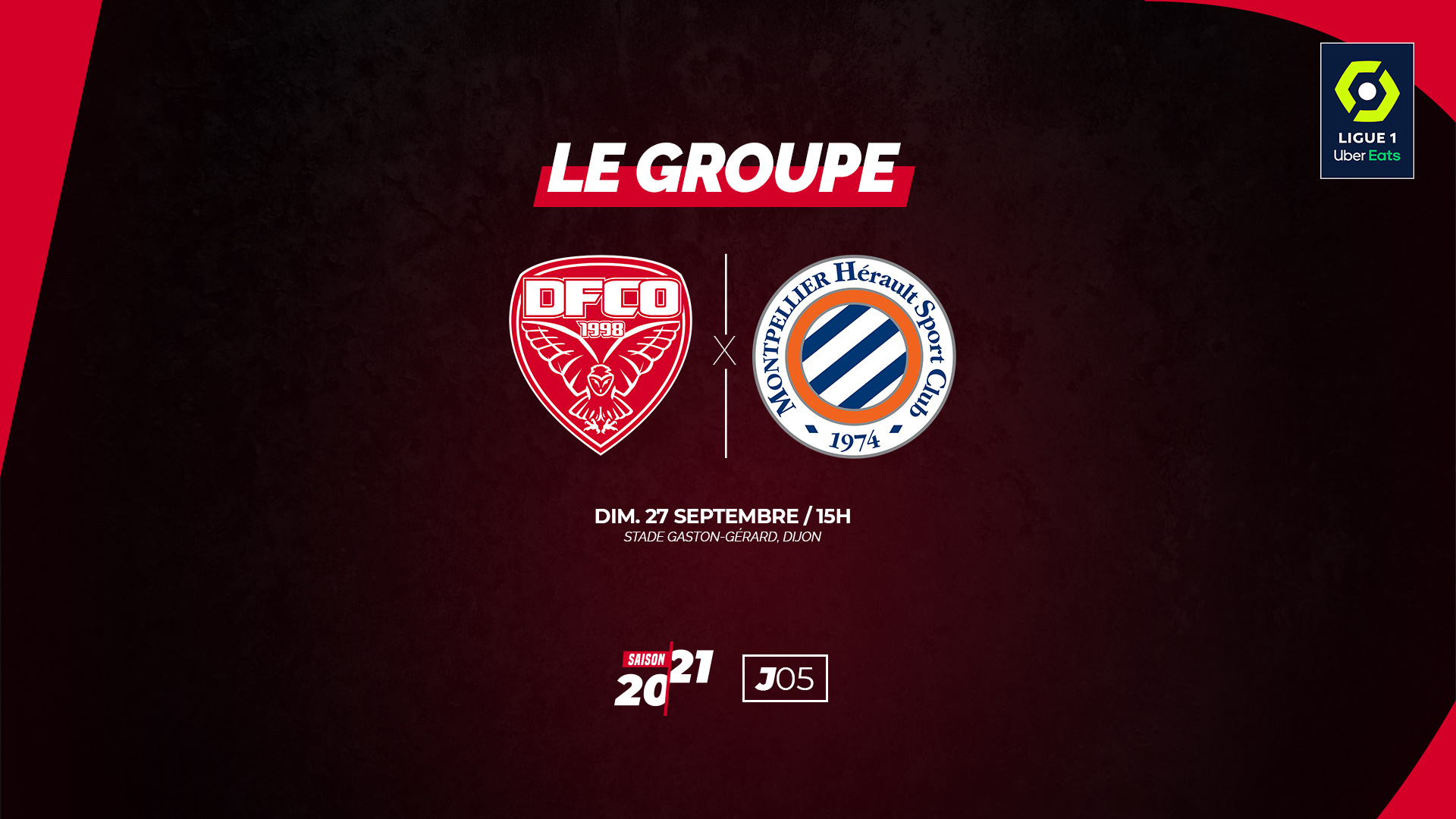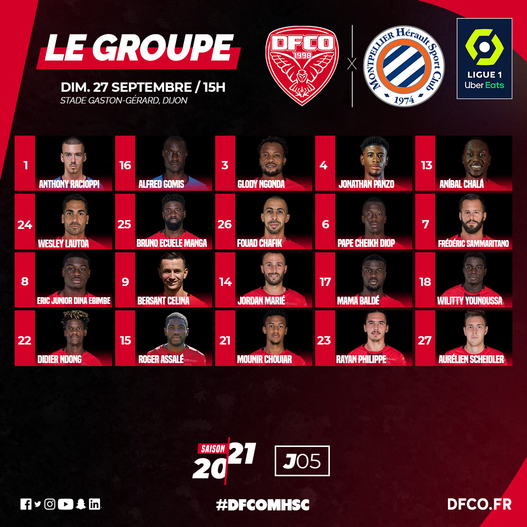 Pour le compte de la 5e journée de Ligue 1 Uber Eats, le DFCO reçoit le Montpellier HSC ce dimanche au stade Gaston-Gérard (coup d'envoi à 15h00). Stéphane Jobard et son staff ont convoqué un groupe de 20 joueurs.
