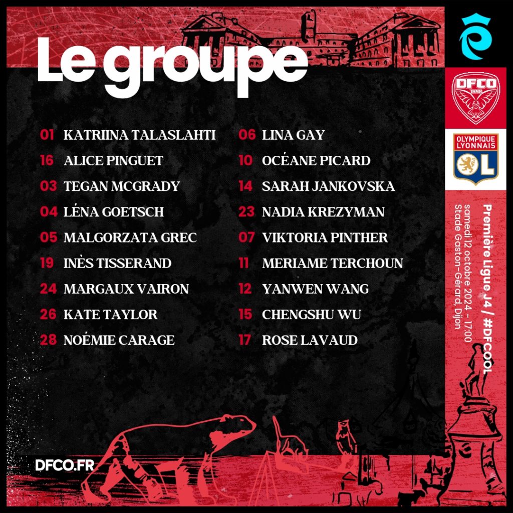 Pour la 4e journée de l’Arkema Première Ligue, le DFCO reçoit Lyon ce samedi 12 octobre à 17h (billetterie). Découvrez le groupe concocté par Sébastien Joseph et son staff.